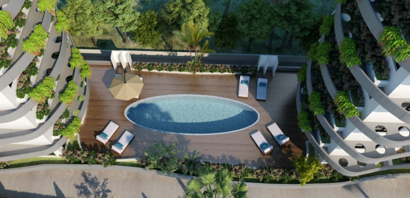 两栋建筑之间设有专属住户使用的共享泳池。此外,地面和地下层还设有绿化区,进一步提升私密感和宜居性。