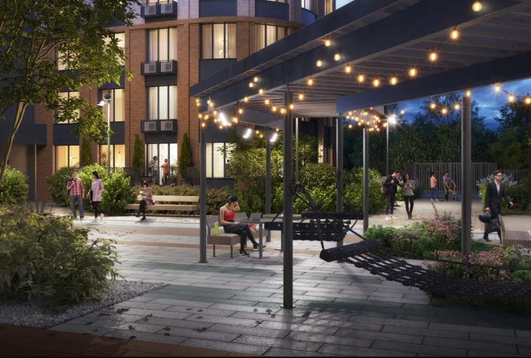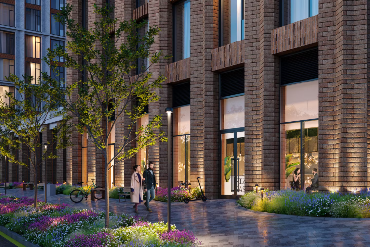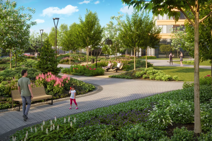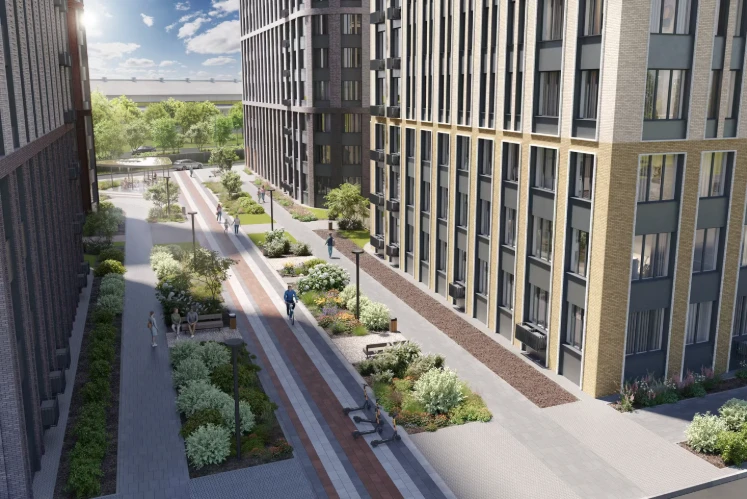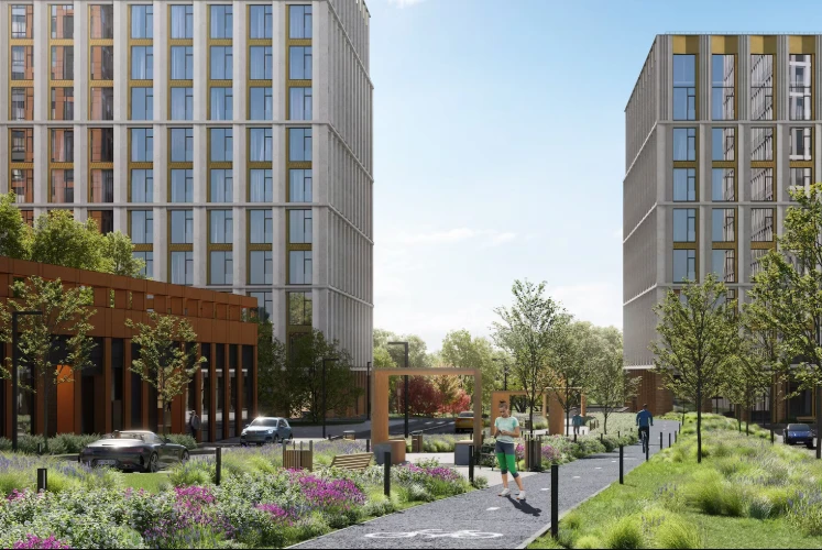 小区计划建设约4000套公寓,打造完善的居住环境,配备公共空间、步行区域和社会基础设施。建筑风格现代,外立面简洁,庭院布局合理。