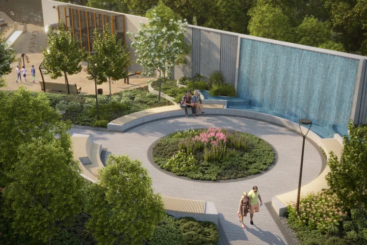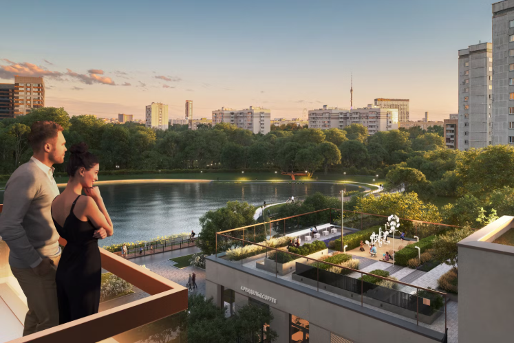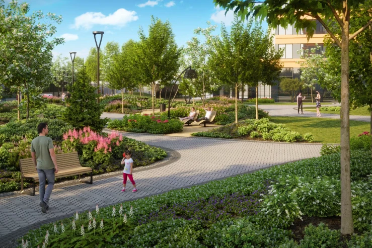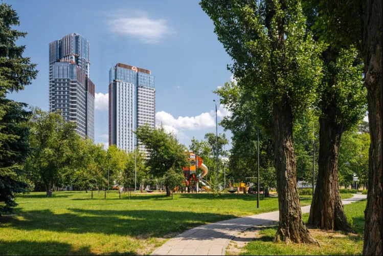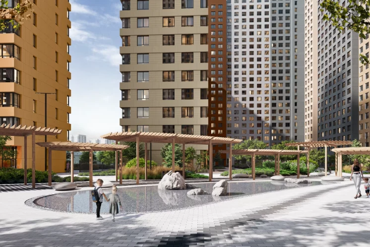 建筑概念体现现代都市风格,拥有独特立面和全景玻璃。设计重点在于创造舒适环境,强调居民的well‑being:自然采光、优质通风、隔音效果和安全空间。小区内设有3.5公顷公园,配有步行道、装饰性水池、喷泉以及儿童和运动场地。
