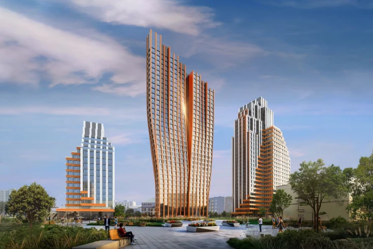 建筑理念基于自然元素:每栋楼代表波浪、火焰或流动。动态立面、全景玻璃以及现代工程设计营造美观外观和明亮居住空间,凸显项目的高端定位。