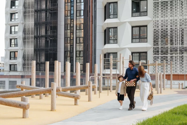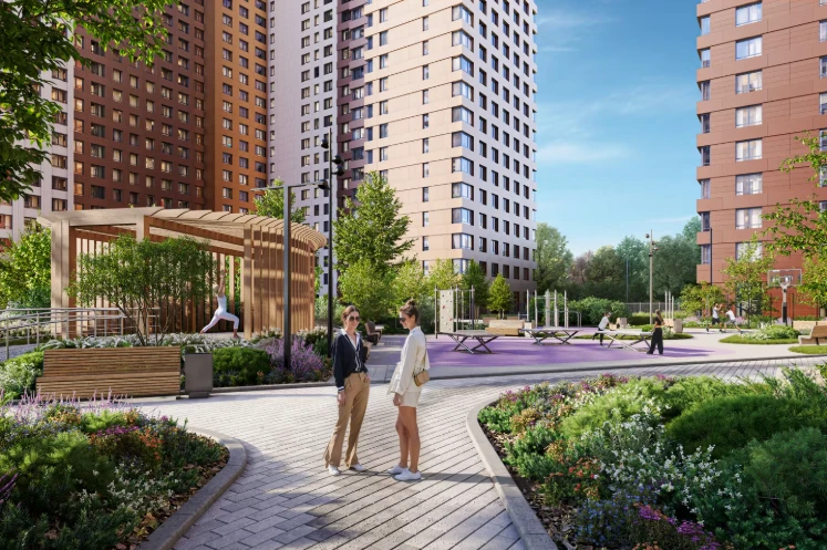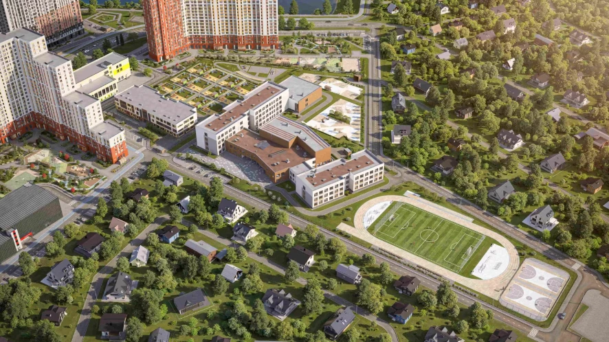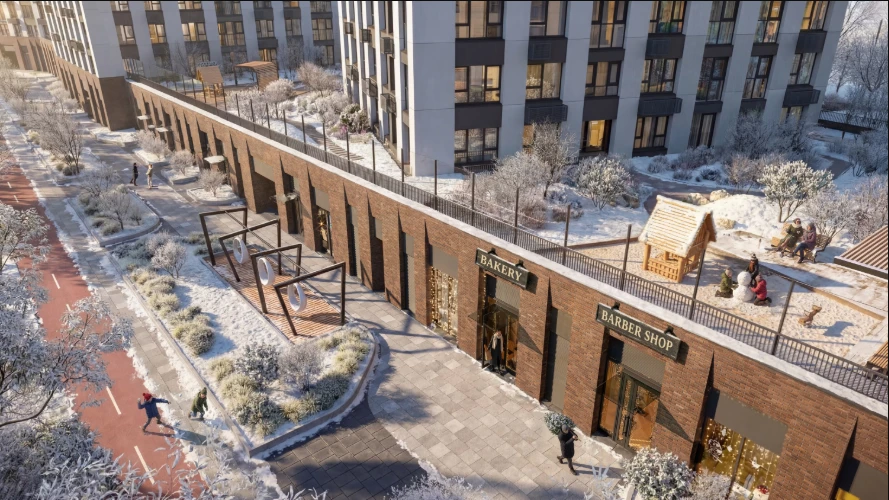 小区规划为独立城市街区:住宅楼与教育机构、休闲区及服务设施相邻,为家庭、专业人士和老年居民提供安全便捷的生活环境。