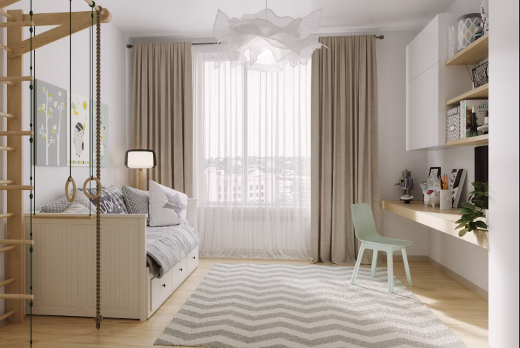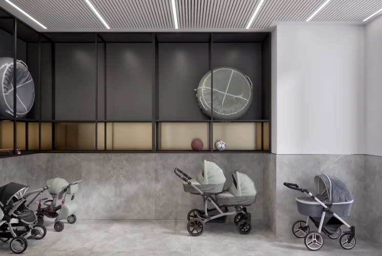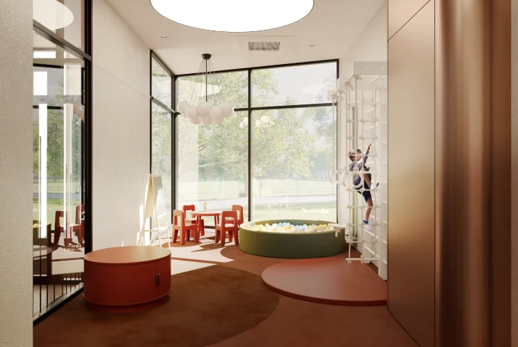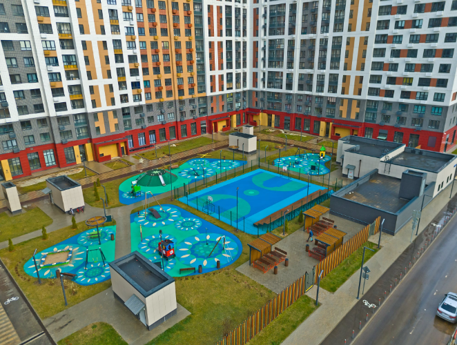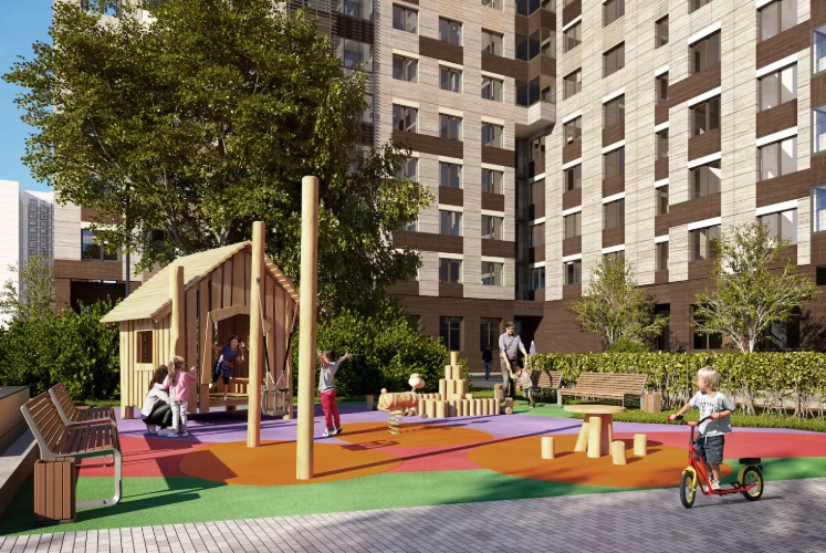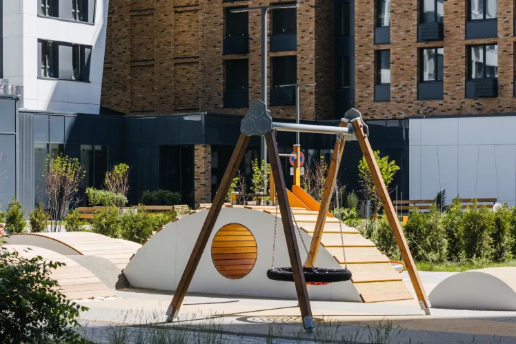住宅楼设计现代、功能性强。小区内庭院禁止车辆通行,确保安全与宁静。小区配有步行道、儿童和运动场、成人休闲区。公寓户型注重城市生活便利:宽敞的厨房-客厅、实用衣帽间及额外储物空间。