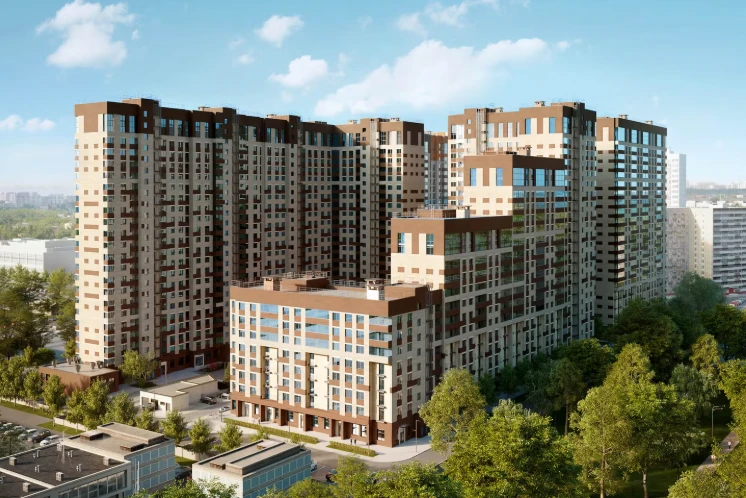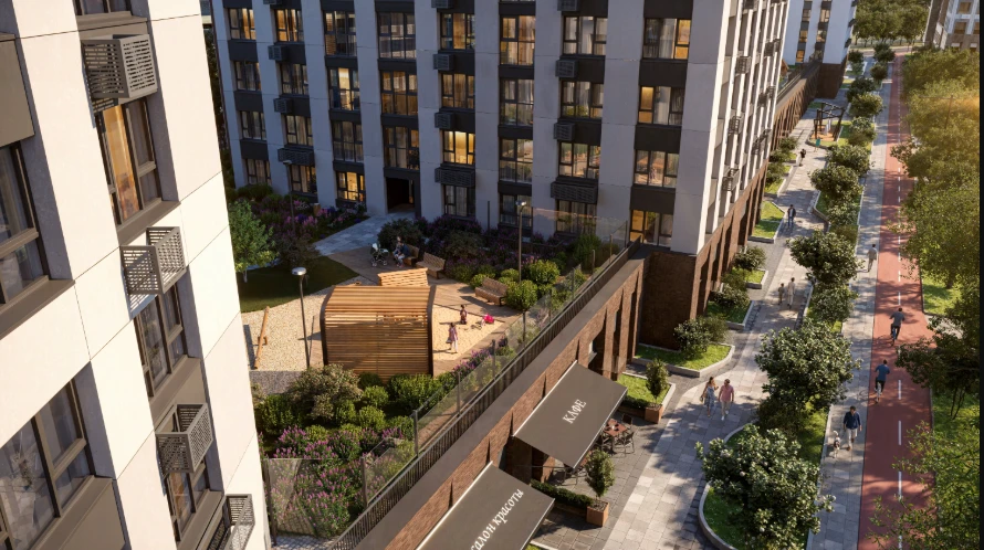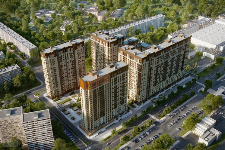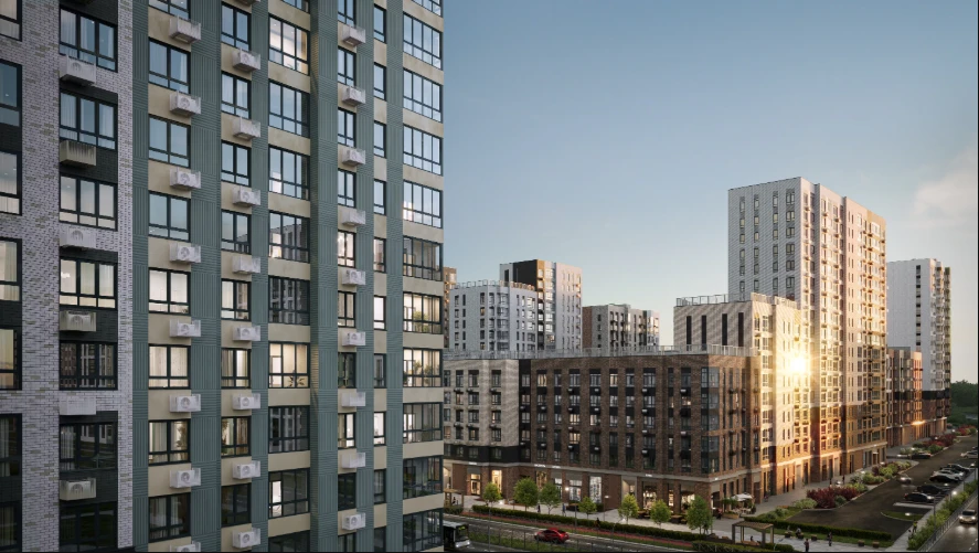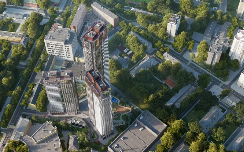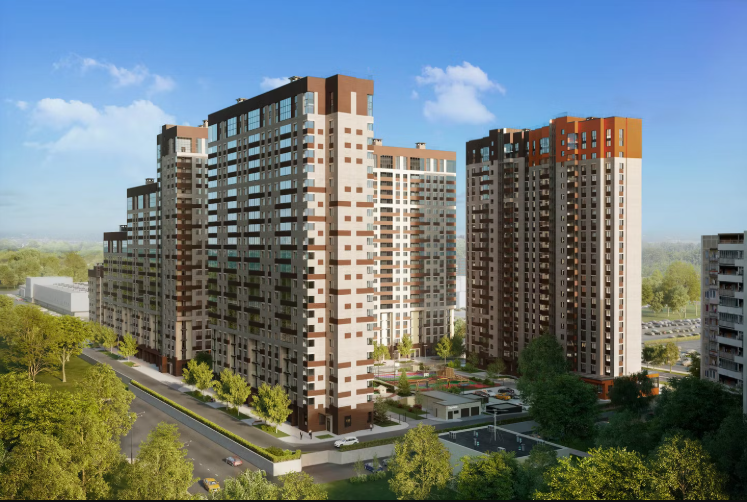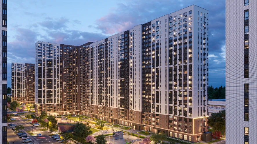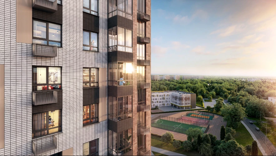 小区由多栋不同高度的住宅楼组成,采用框架-砖结构施工技术,确保建筑耐久性和舒适居住条件。公寓面积从紧凑型单间到宽敞多居室不等,可选择毛坯交付、White Box交付或精装修交付。