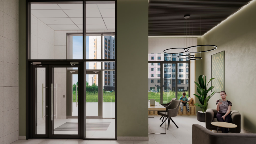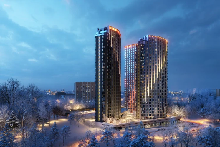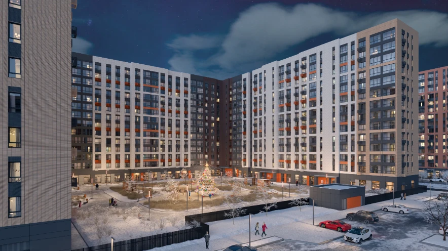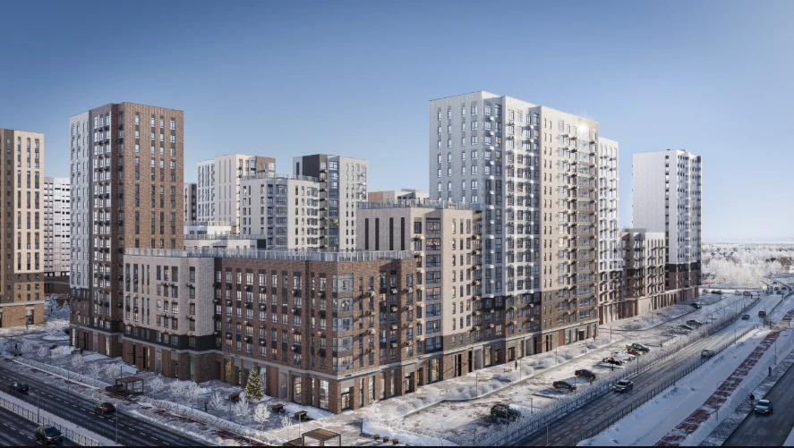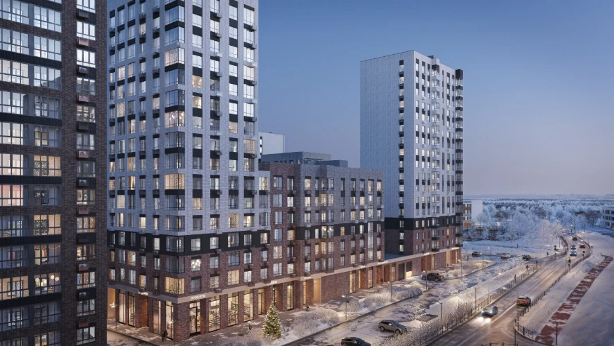 住宅区由 6 栋建筑 构成,高度 12–15 层,采用现代板式建筑技术建造。所有楼栋已竣工交付,可立即入住。