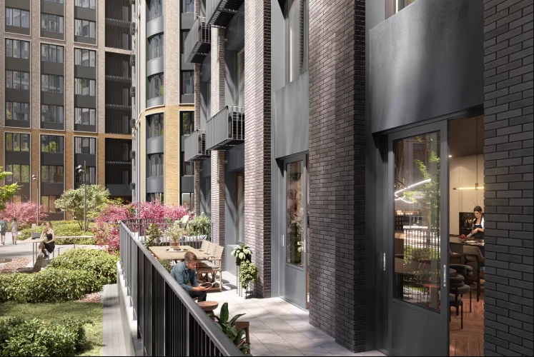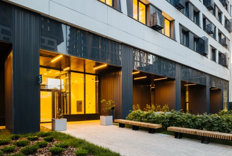 建筑设计采用现代城市风格:整洁的中性色外立面、景观庭院、无车步行区,以及合理安排的公共空间。