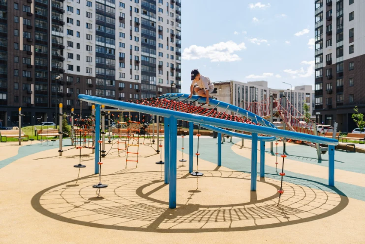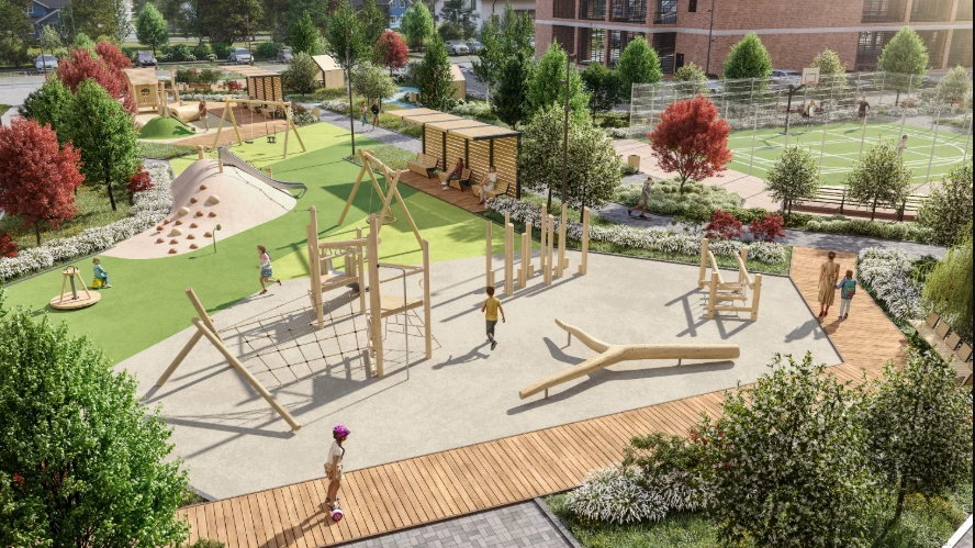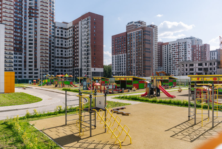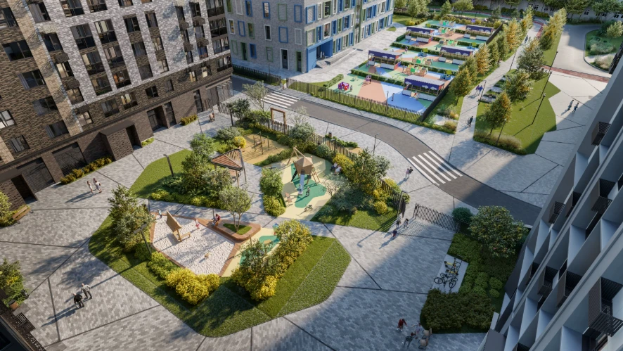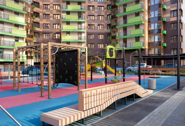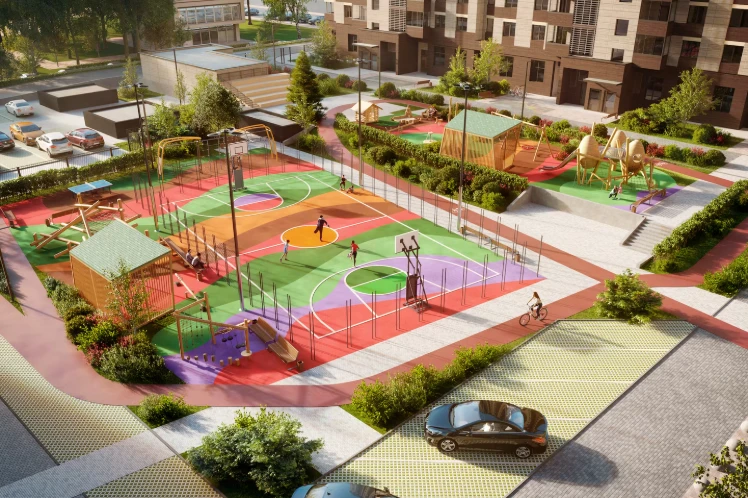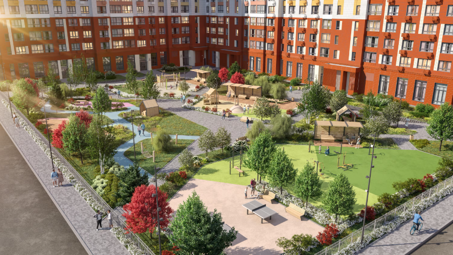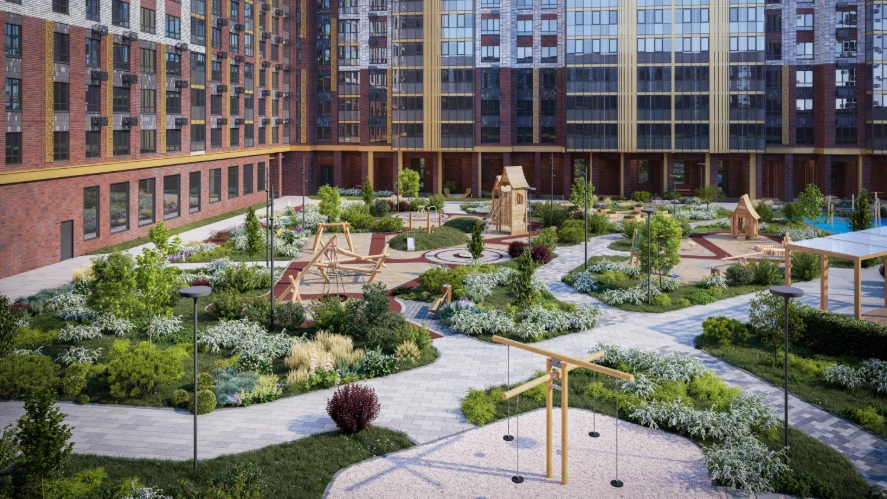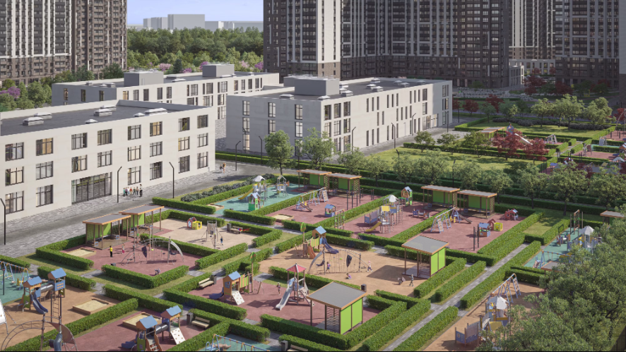 小区作为独立社区规划:住宅楼与教育机构、休闲区及服务设施和谐结合,为各类居民提供安全便捷的生活环境,包括有孩子的家庭、职场专业人士及老年居民。