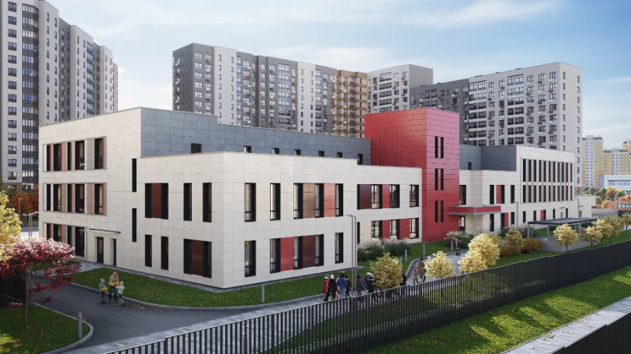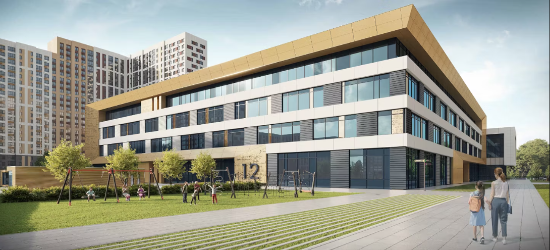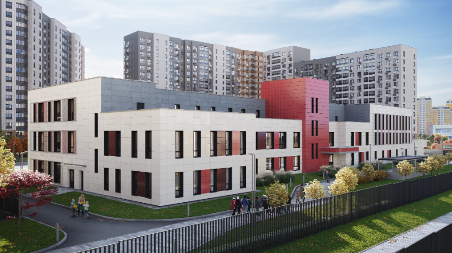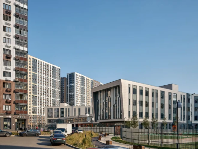 小区设计为独立的城市街区,住宅楼、教育设施和休闲区形成和谐统一的空间,适合长期居住。