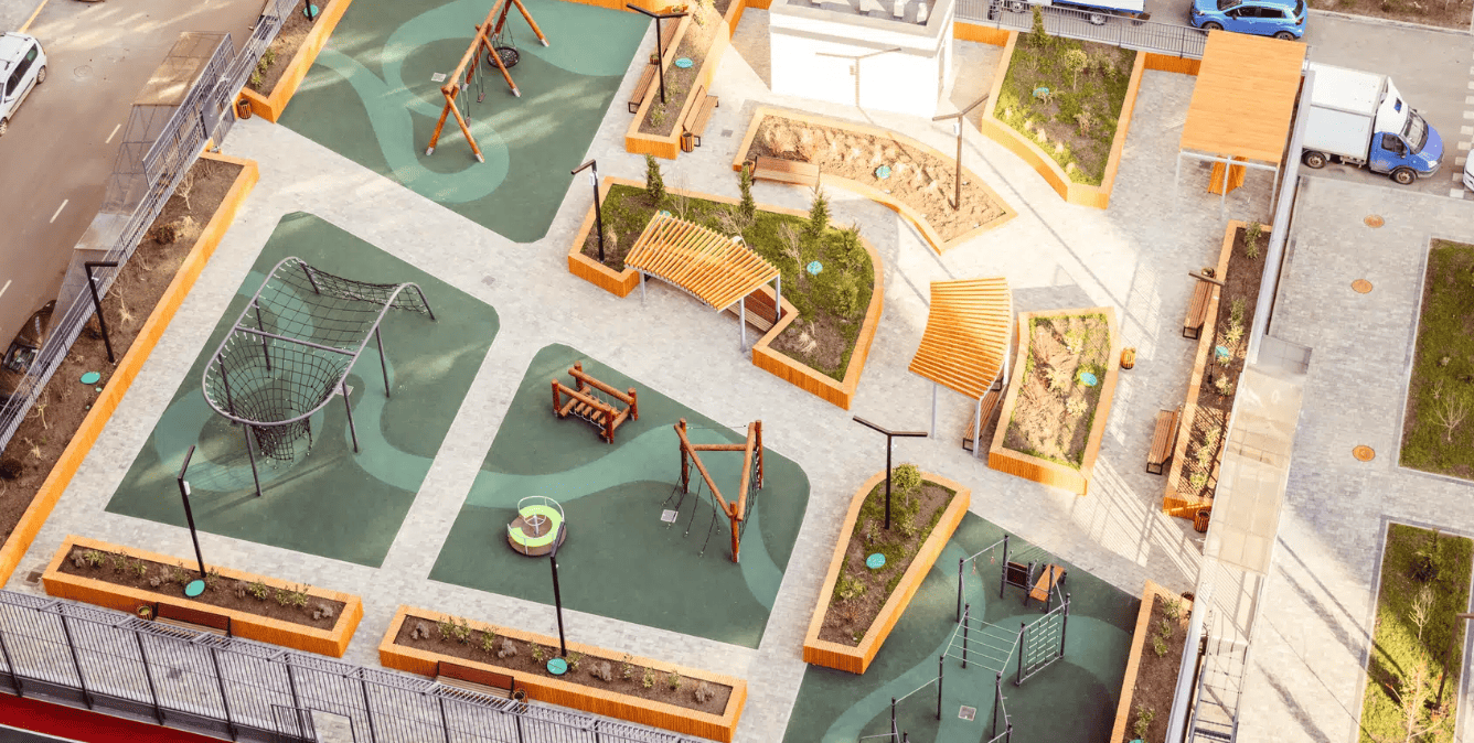 在安全与庭院品质方面,项目尤为用心。1至16号楼实行 “人车分流” 原则,内部庭院禁止车辆进入;住户使用 地下停车场,访客车辆则停靠于街区外围。17号与18号楼采用 架空平台式庭院 设计:地面层为儿童游乐区和运动场地,下方为封闭式停车场。