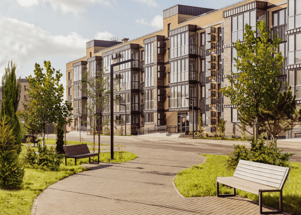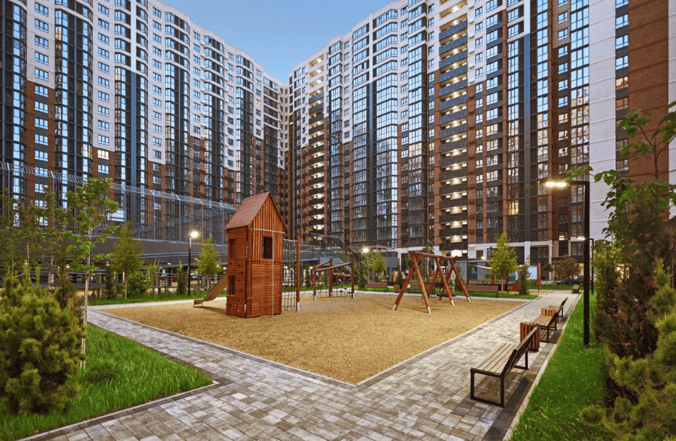 庭院设计采用两种模式:部分楼宇采用 架空平台式(стилобат) 结构——底层为封闭式停车场,上层则规划为休憩区、儿童游乐场及运动场地;其余区域则设有 地面庭院,配备同等品质的设施,确保整个社区环境标准统一、品质如一。