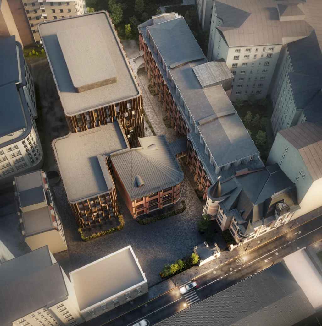 综合体由四栋建于19至20世纪的历史建筑改造而成。每栋建筑均拥有独特的历史背景与建筑特征,同时通过内部庭院形成统一而协调的整体空间。