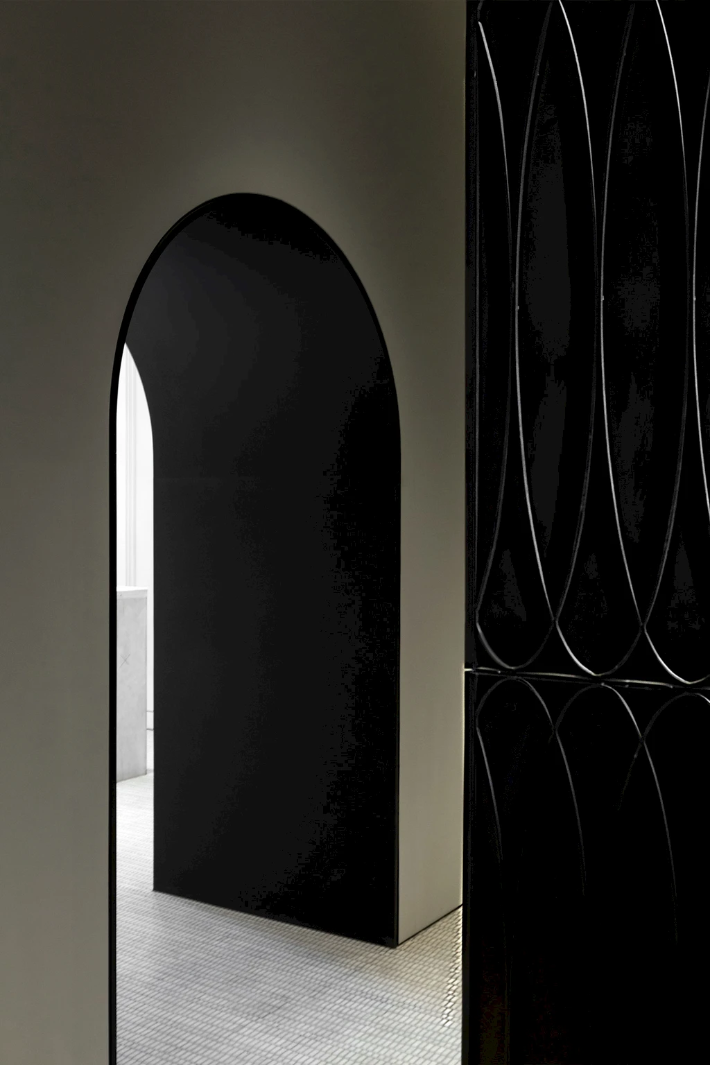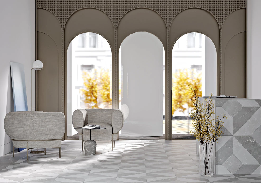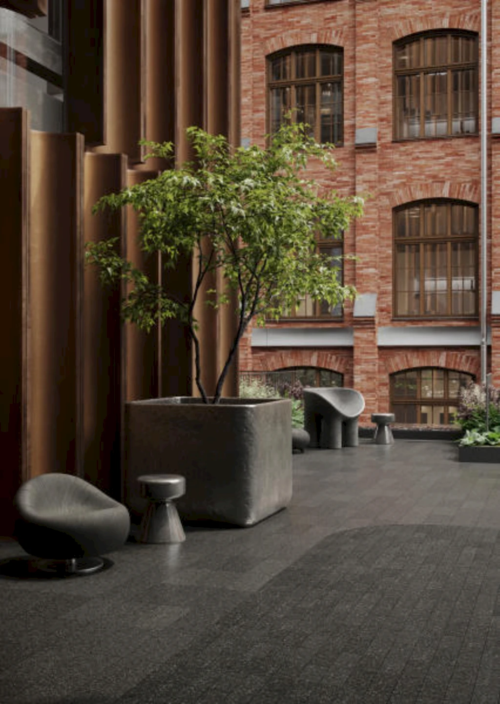 项目在景观设计方面尤为用心:内部庭院铺设深色调马赛克地面,灵感源自欧洲古典广场。