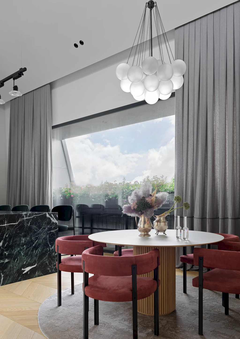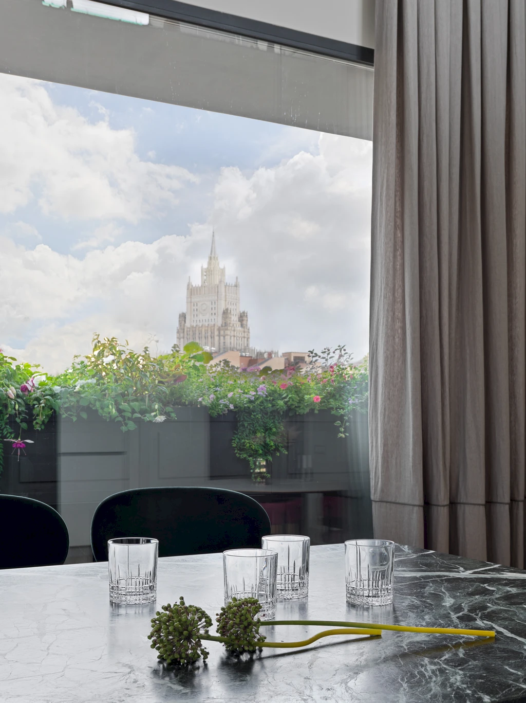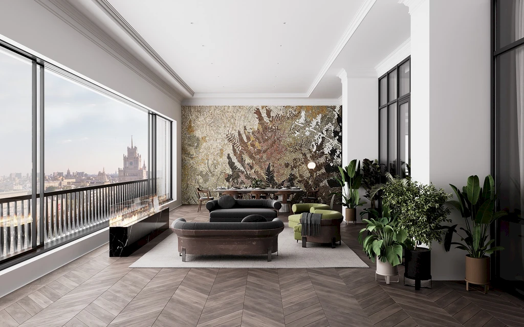 住宅空间提供多样化公寓,包括可俯瞰莫斯科市中心的宽敞顶层公寓。所有公寓均采用高品质材料装修,如大理石、木材及设计师配件。1,067.4 平方米的顶层公寓可毛坯交付,以便进行个性化室内设计。每套公寓配备完整工程系统,确保舒适与安全。
