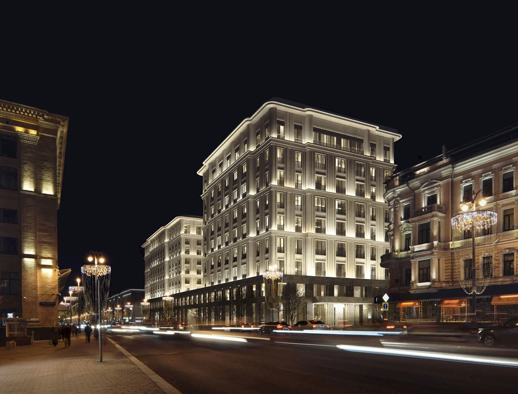 项目由两栋建筑组成,统一的建筑理念使其与特维尔街历史街区完美融合。建筑设计由 SPEECH 事务所(Sergey Choban 主持)完成。立面设计结合了严谨的线条与柔和的轮廓,突出综合体的优雅感,同时与周围城市环境保持和谐。