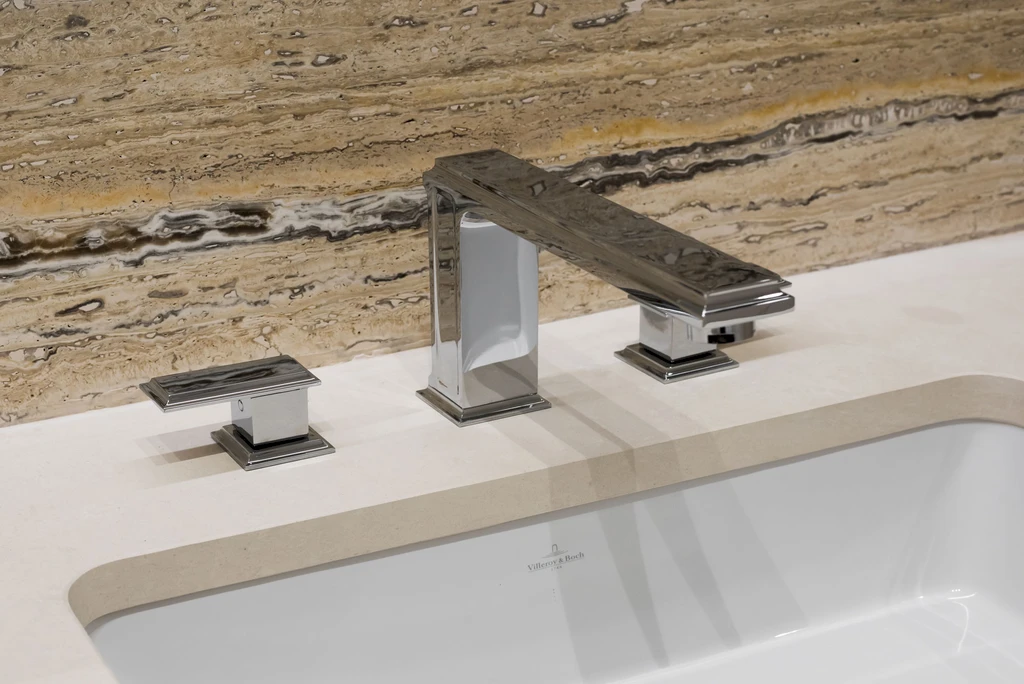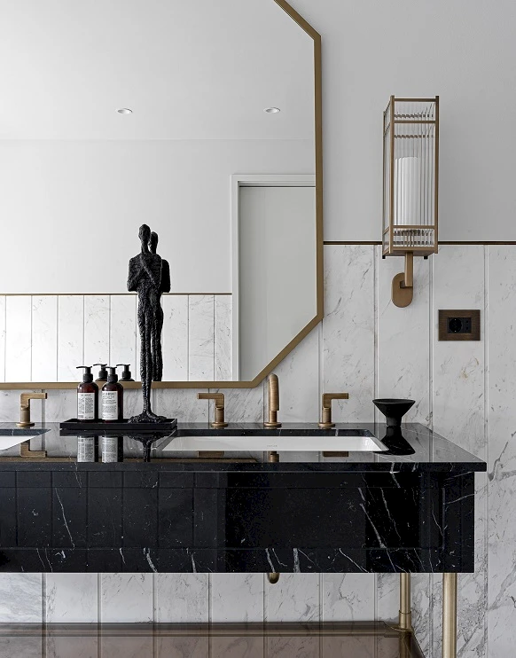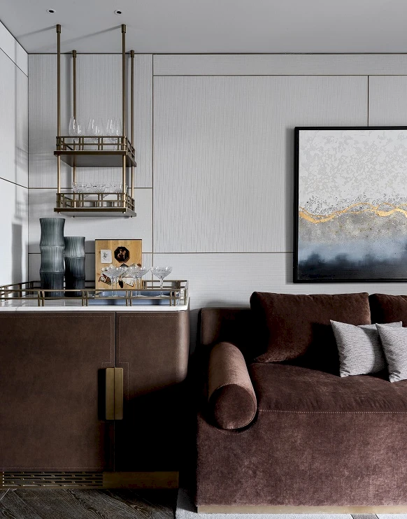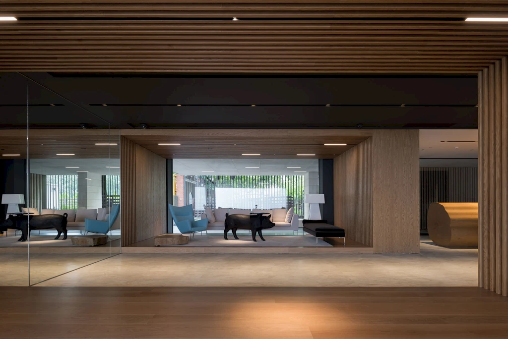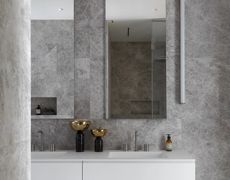 公共空间采用天然石材、金属与木材装饰。大堂设计风格现代而克制。