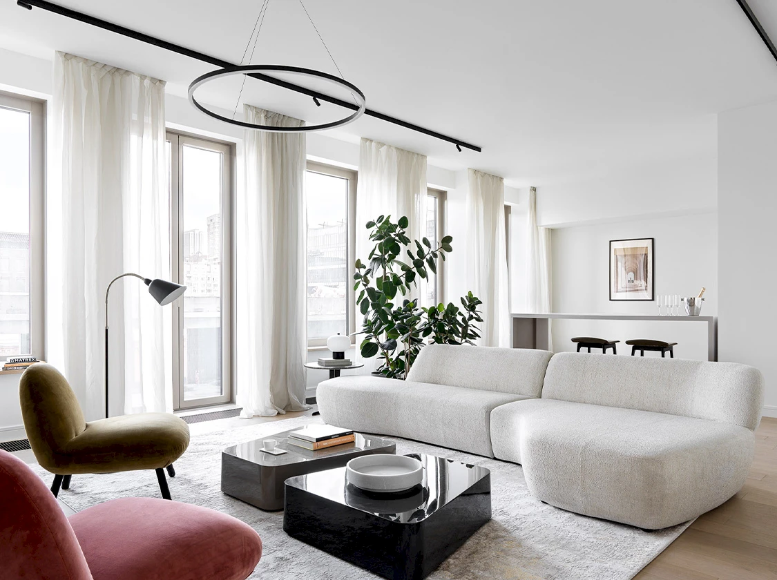 综合体提供多种户型的公寓,注重功能性和舒适性。宽敞的客厅、主卧室及合理划分的功能区域为生活提供便利。室内采用优质材料和设计方案,兼具美感与舒适度;大窗户和高挑的天花板增强了采光和空间感。