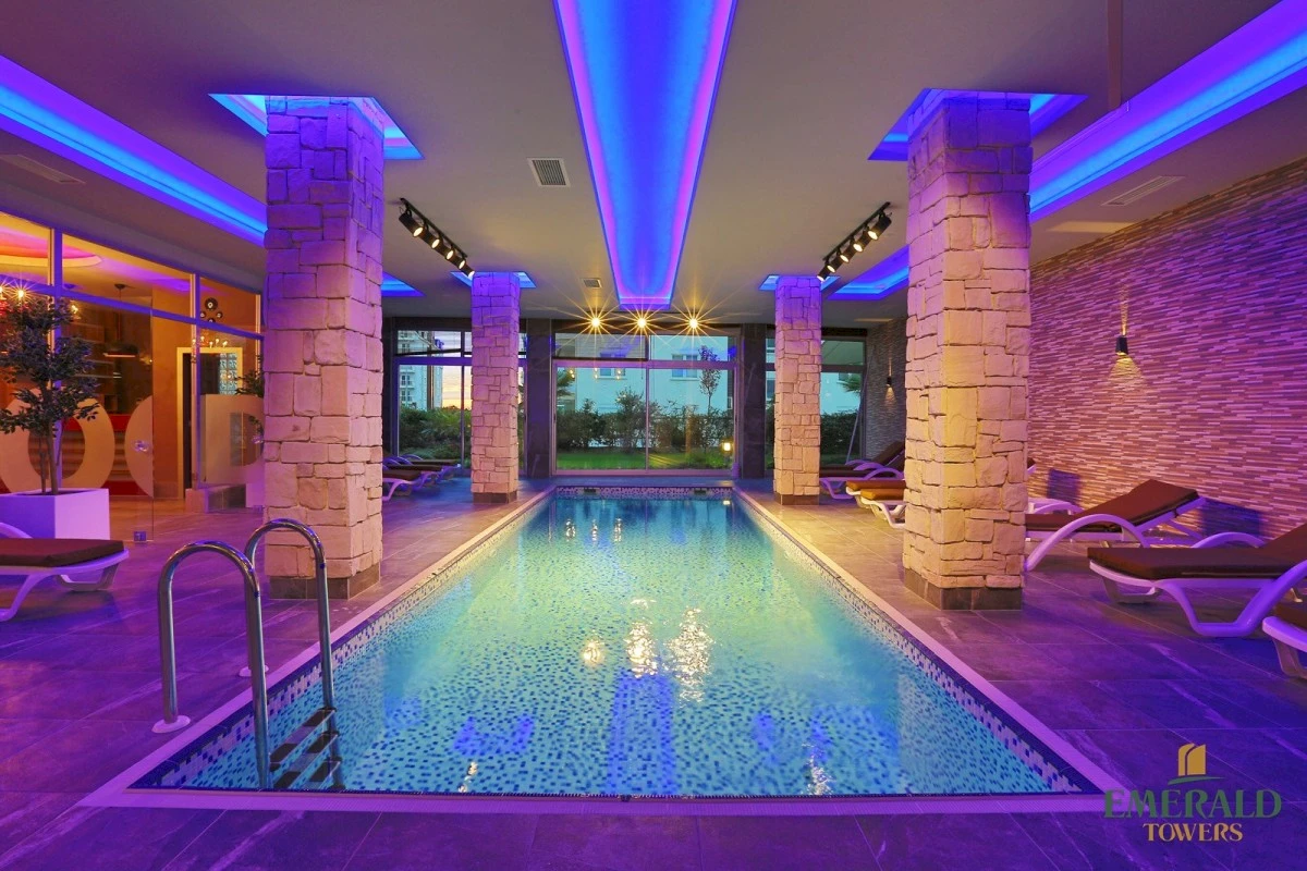 综合体提供众多休闲设施:室外游泳池、恒温室内游泳池、水滑梯、健身房、桑拿、游戏室和土耳其浴,确保每位住户都能放松身心,尽享惬意生活。