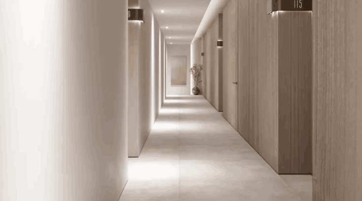 该综合大楼提供各种一室公寓、一居室和两居室公寓。住宅的居住面积从单间公寓的 34 平方米到两居室公寓的 103 平方米不等。每间公寓均配备至少一个阳台和一个内置衣柜或更衣室。一些布局包括额外的设施,如洗衣房、壁橱和宽敞的走廊。室内设计风格优雅、沉稳。