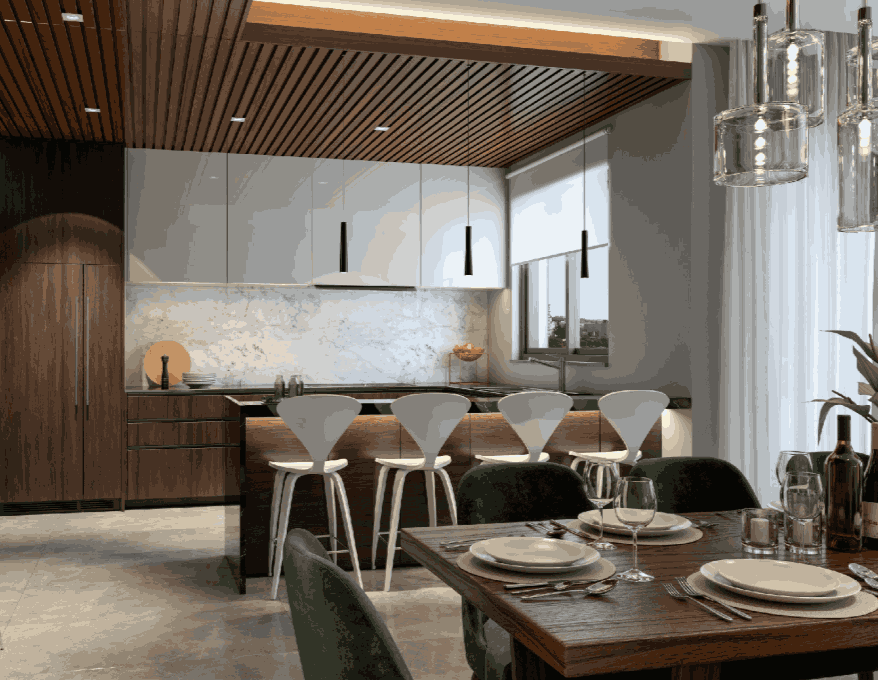 Внутри каждого апартамента использованы материалы высокого класса и продуманный дизайн — от роскошных напольных покрытий и элегантной отделки до умного планирования пространства и индивидуальных решений. Результат — гармоничное сочетание современной элегантности и долговечного качества.