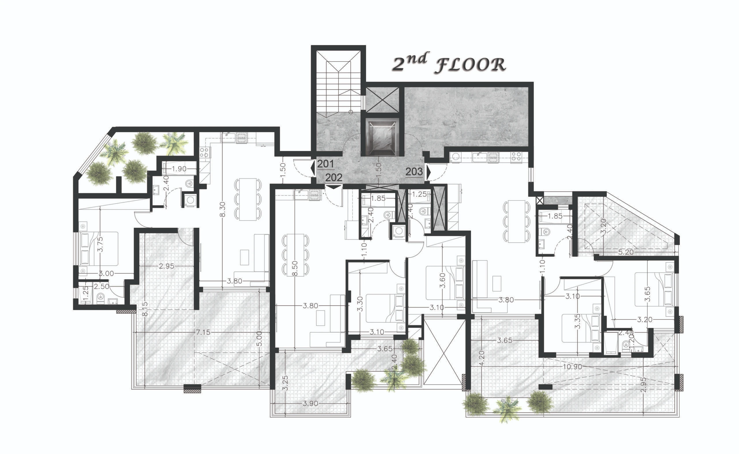 Квартира 203: 2+1 спальни, 85,6 м² + 15,9 м² крытая веранда + 39,0 м² открытая веранда + 4,3 м² зелёная зона.