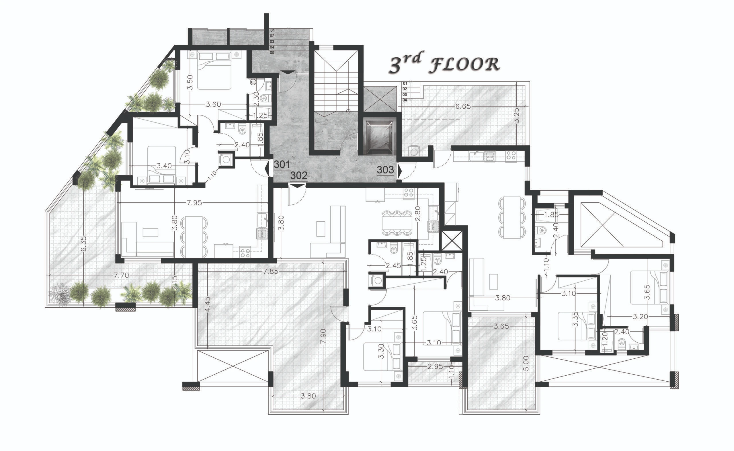 Квартира 302: 2+1 спальни, 79,0 м² + 44,8 м² крытая веранда + 10,3 м² открытая веранда.
