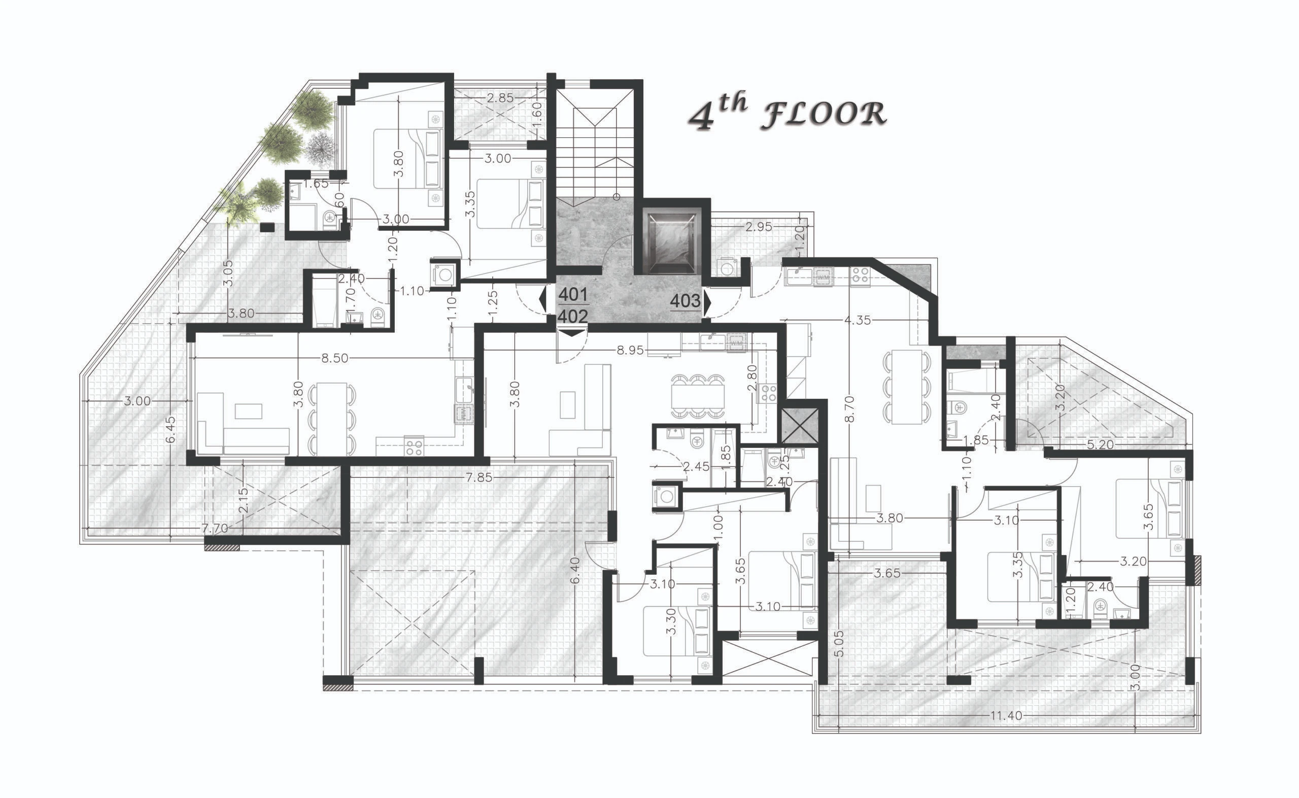 Квартира 401: 2+1 спальни, 86,3 м² + 24,8 м² крытая веранда + 25,8 м² открытая веранда + 8,8 м² зелёная зона + 54,5 м² сад на крыше.