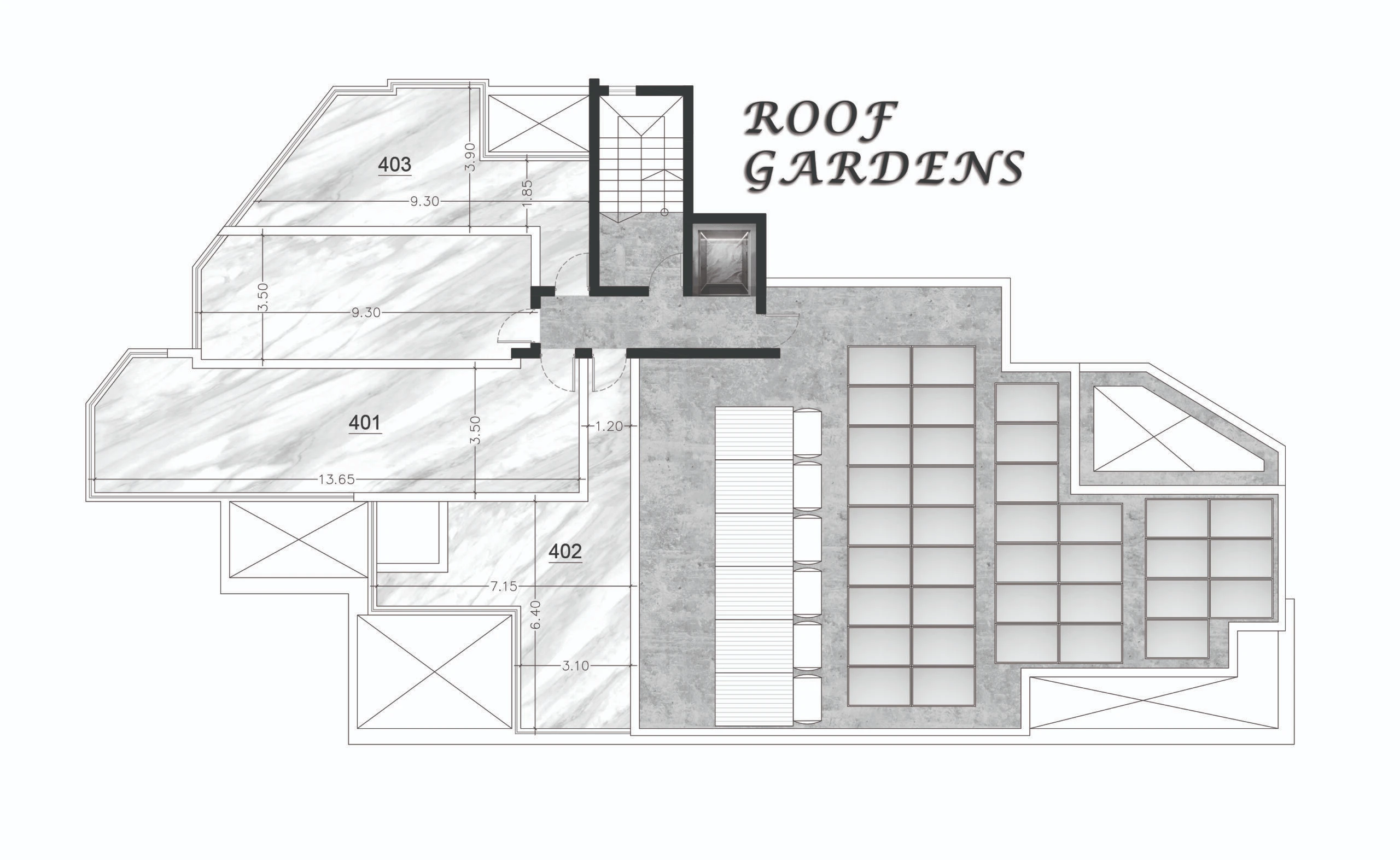 Квартира 403: 2+1 спальни, 87,3 м² + 14,5 м² крытая веранда + 50,3 м² открытая веранда + 34,3 м² сад на крыше.