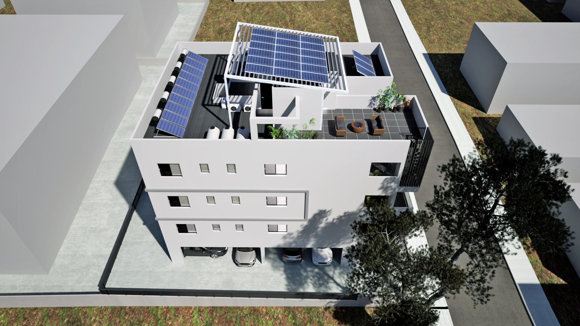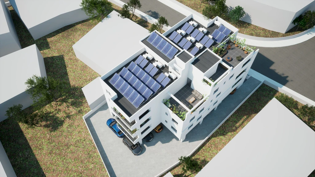 Здание соответствует высокому классу энергоэффективности (Class A). Для каждой квартиры предусмотрена возможность установки фотоэлектрической системы мощностью 2 кВт, что позволяет снизить расходы на электроэнергию и сделать жильё более экологичным.