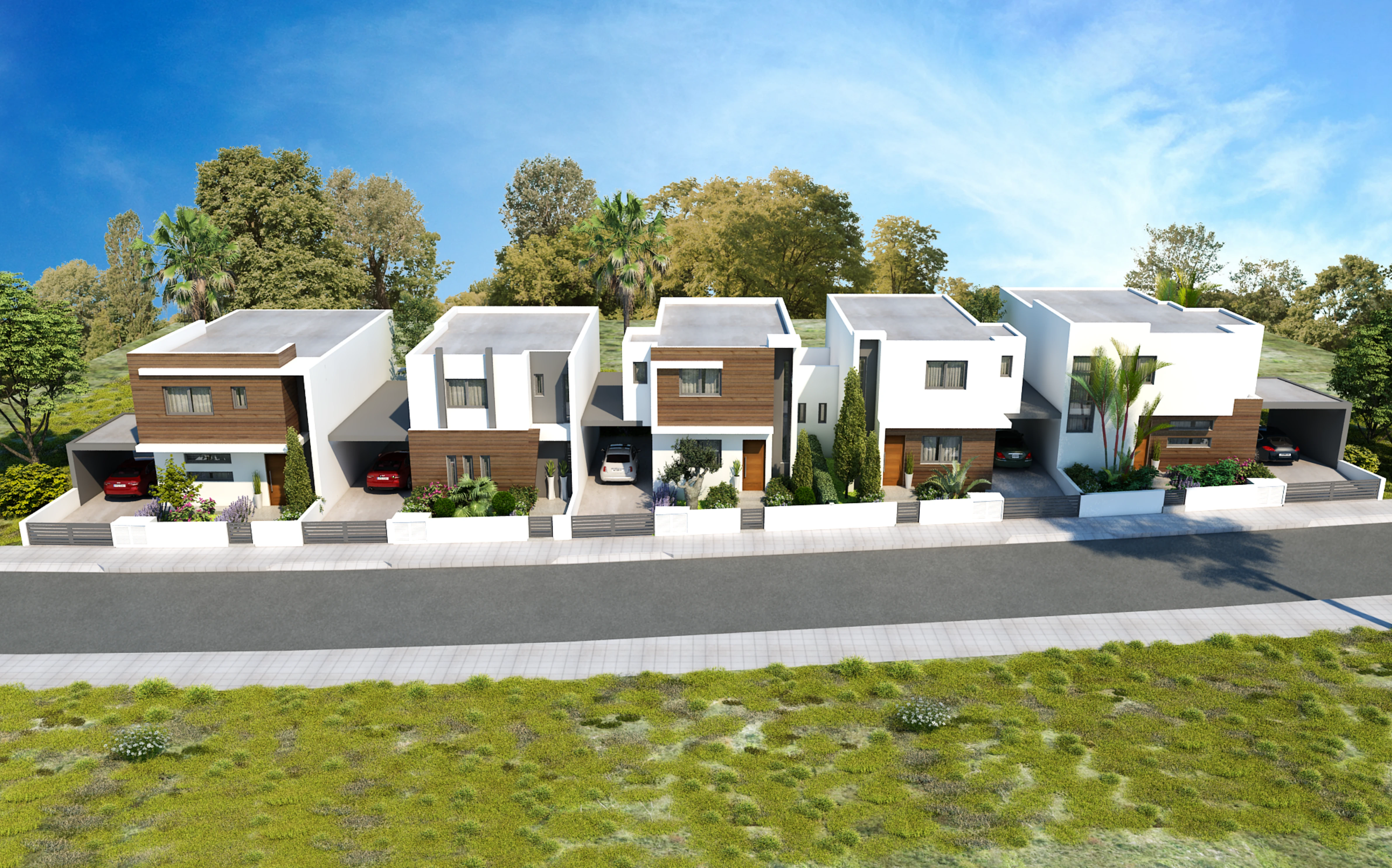 Дома выполнены в минималистичном архитектурном стиле, где функциональные формы гармонично сочетаются с тёплыми тонами фасадов и природным окружением.