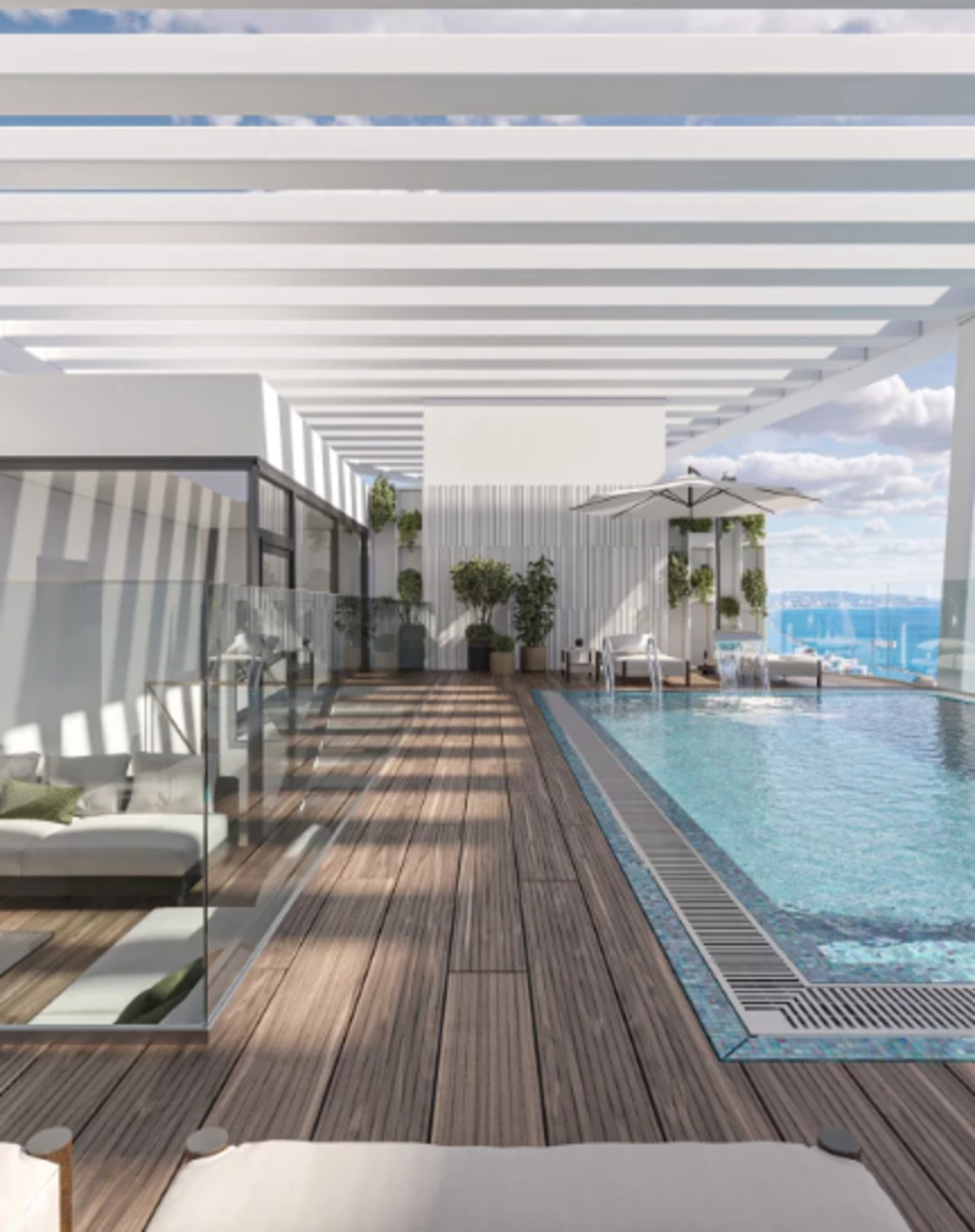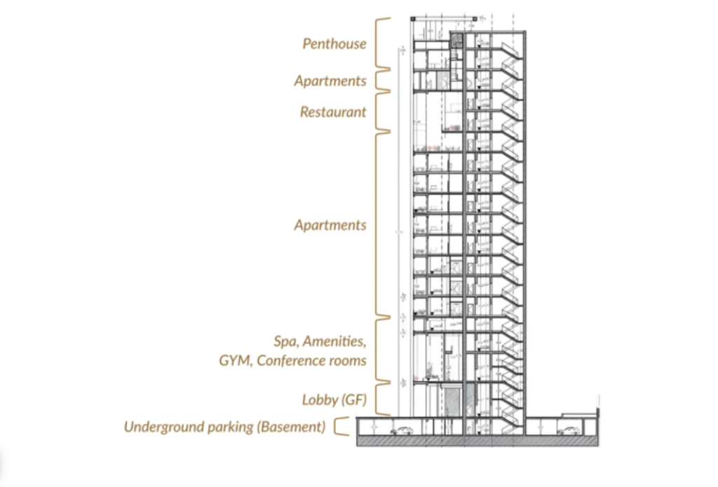 В комплексе предусмотрено 32 эксклюзивных апартамента, расположенных с 4-го по 17-й этаж. Все квартиры имеют просторные планировки, панорамные окна и просторные веранды с видами на море и город.