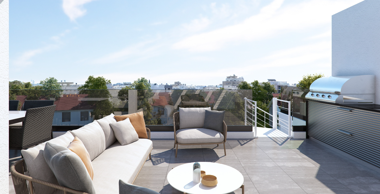Этажи выше предназначены для более просторных апартаментов, включая эксклюзивные резиденции на 6-м этаже, каждая из которых предлагает 4 спальни и имеет индивидуальный выход на частный сад на крыше (7-й этаж). Там находятся дополнительная спальня, санузел с душем, сауна, а также уютная терраса с барбекю-зоной. Для повышения энергоэффективности эти пентхаусы оснащены солнечными панелями с системой нет-метеринга, что позволяет значительно снизить коммунальные расходы.