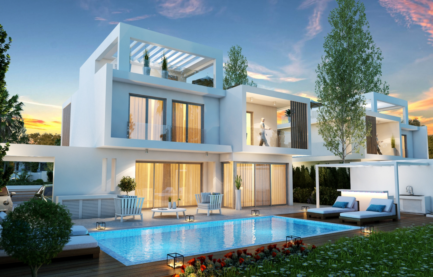 Проект продуман до мелочей: двойной крытый гараж, ухоженный сад с возможностью установки бассейна, летний душ, а также зона для гриля и отдыха на открытом воздухе. Это идеальное место для наслаждения тёплым климатом Кипра в кругу семьи или друзей.
