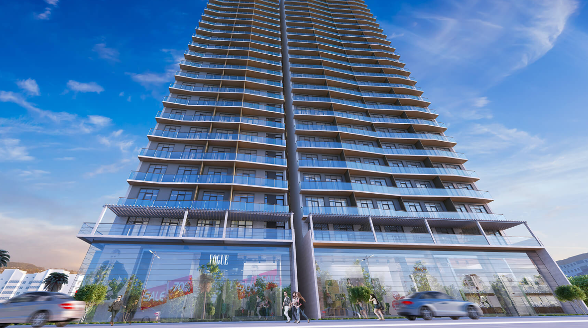 Natural granite is used in the lobby finishes, the facade is protected with waterproofing, and the apartments feature panoramic windows and spacious balconies offering sea and city views. Ceiling heights reach 3 meters, creating a sense of space and light.