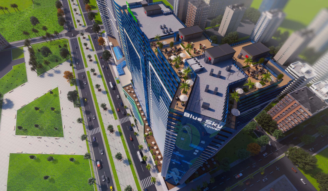 Blue Sky Tower is designed in a modern high-rise style with panoramic glazing, offering views of the sea, mountains, and the city.