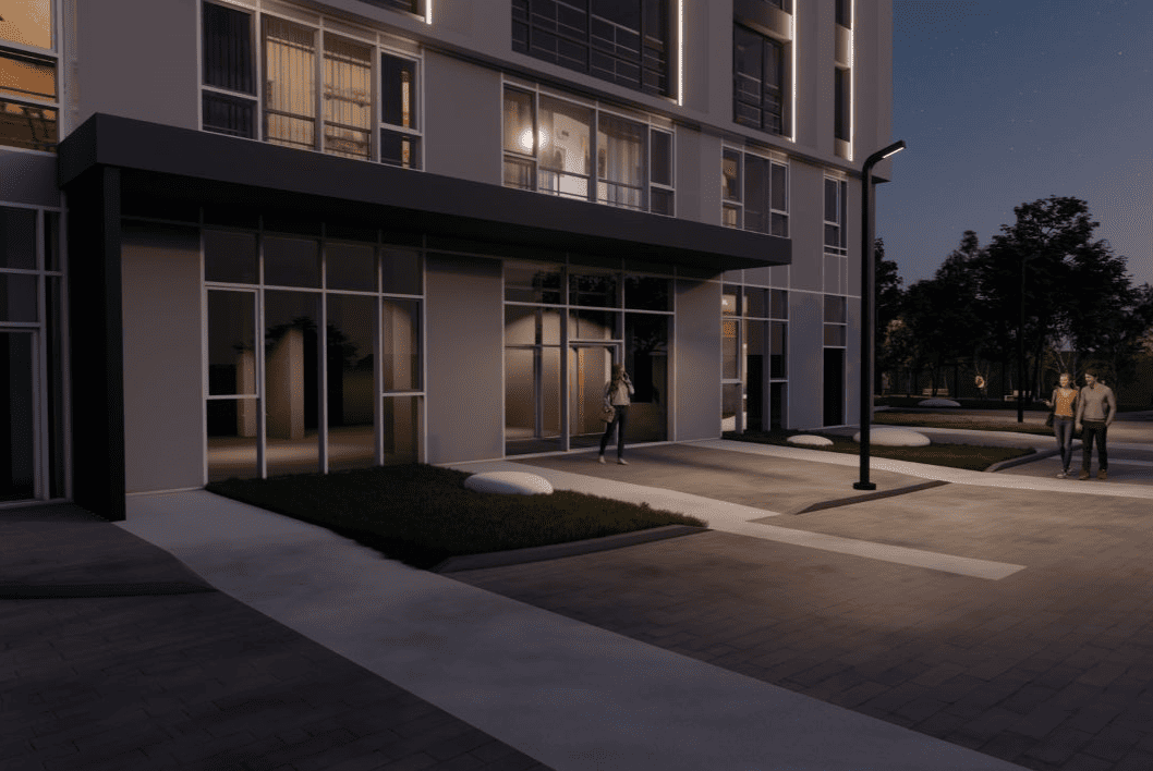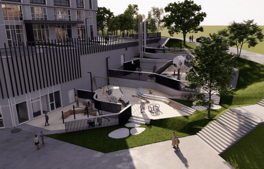 The complex features a thoughtfully designed courtyard ideal for family strolls, an underground parking garage, and dedicated on-site amenities tailored for everyday comfort.