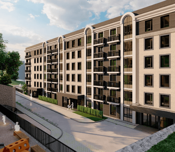 The complex comprises a single 9-story building offering apartments ranging from 70.3 to 100.5 m², delivered without finishes to allow for personalized interior design.