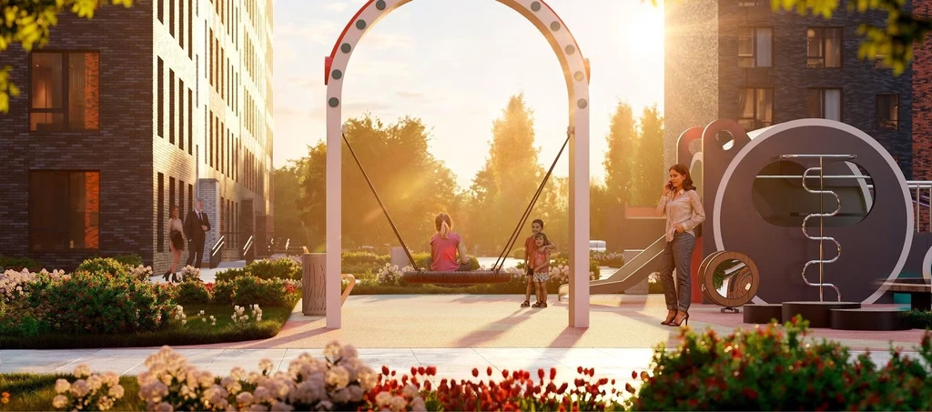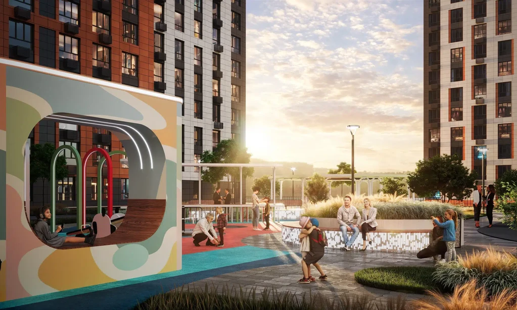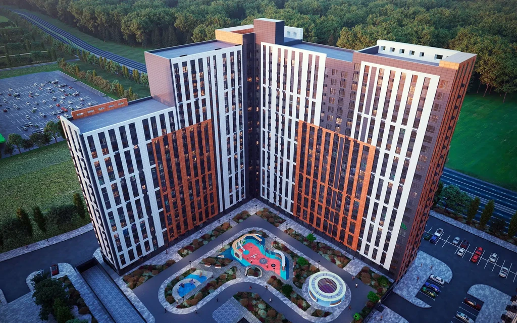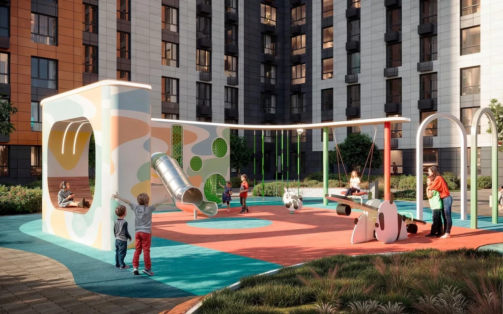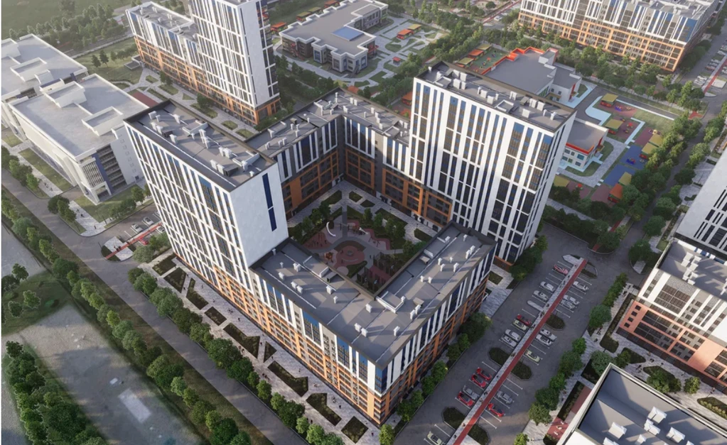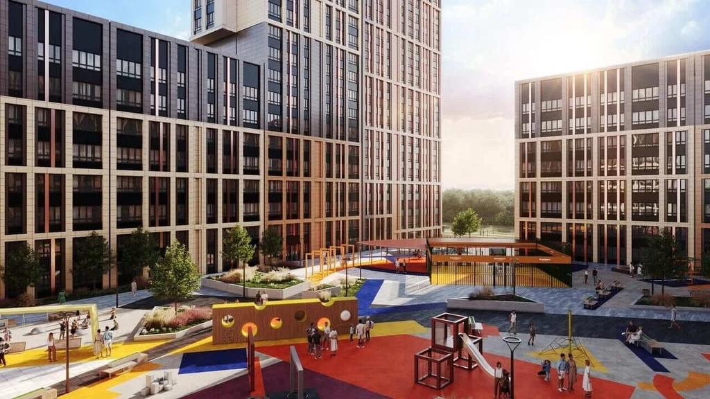 The project includes 10 buildings ranging from 9 to 18 floors, occupying a total area of 17.9 hectares. The development features two kindergartens, a school, playgrounds, and designer lounge areas for residents. Each courtyard has been created in collaboration with psychologists to ensure safety and comfort for families with children.