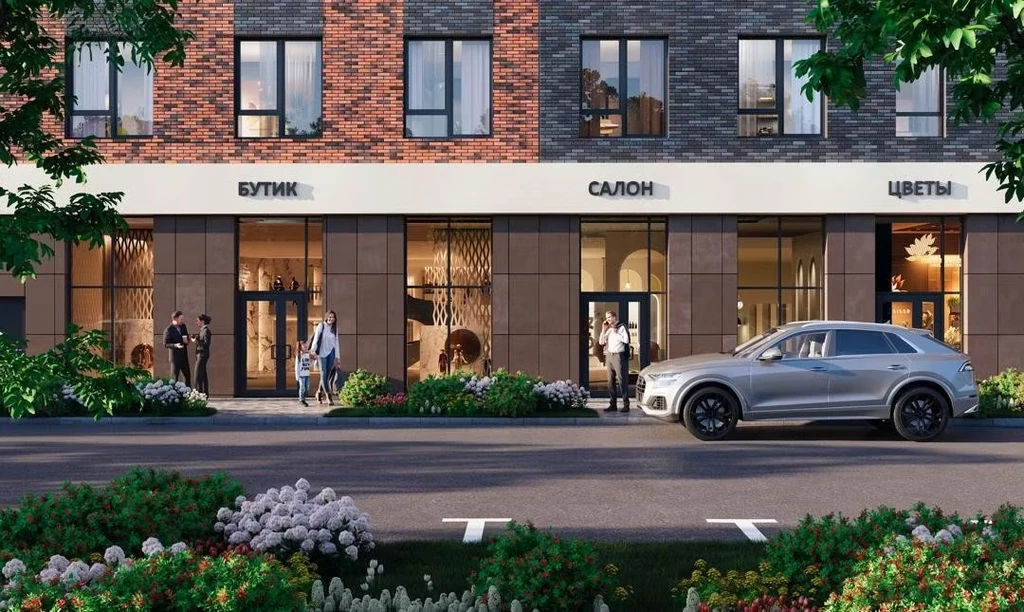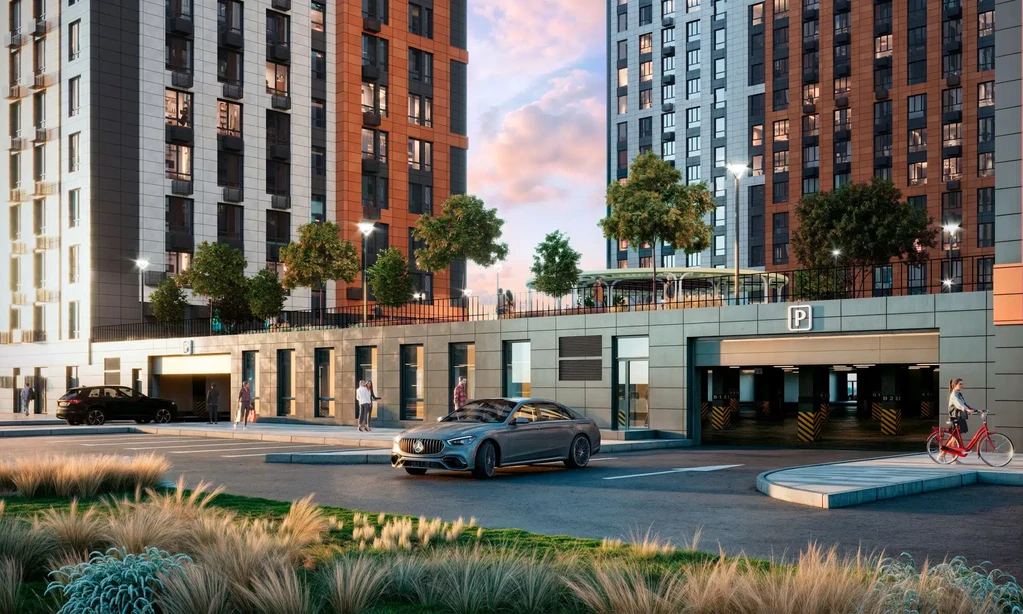 Ground floors host shops, beauty salons, and cafés. Underground parking with direct elevator access ensures convenience for residents.