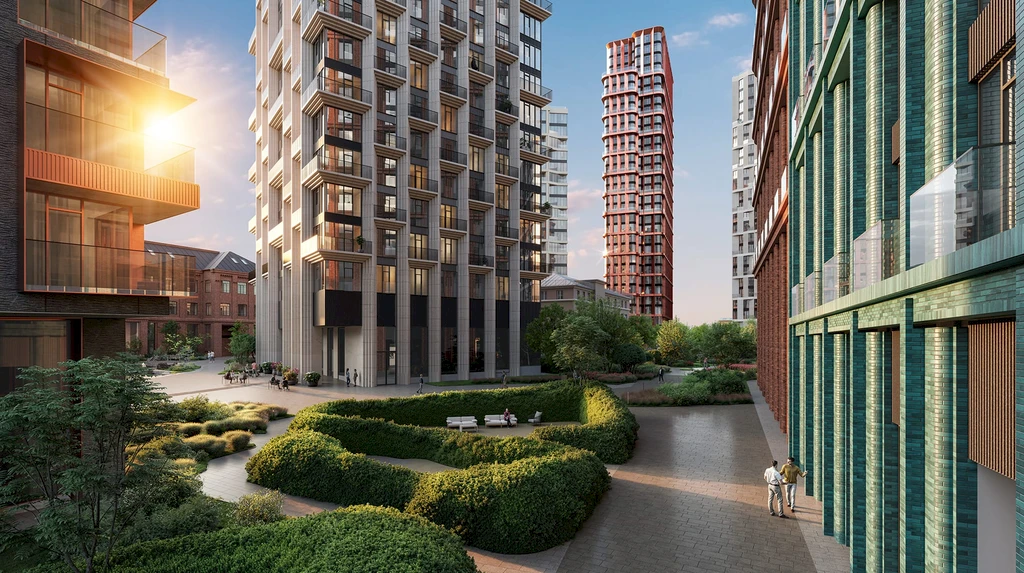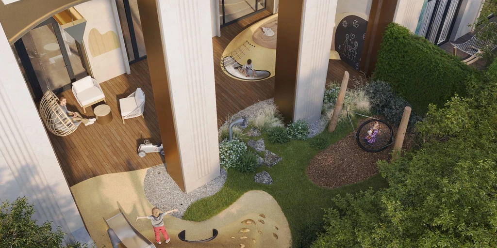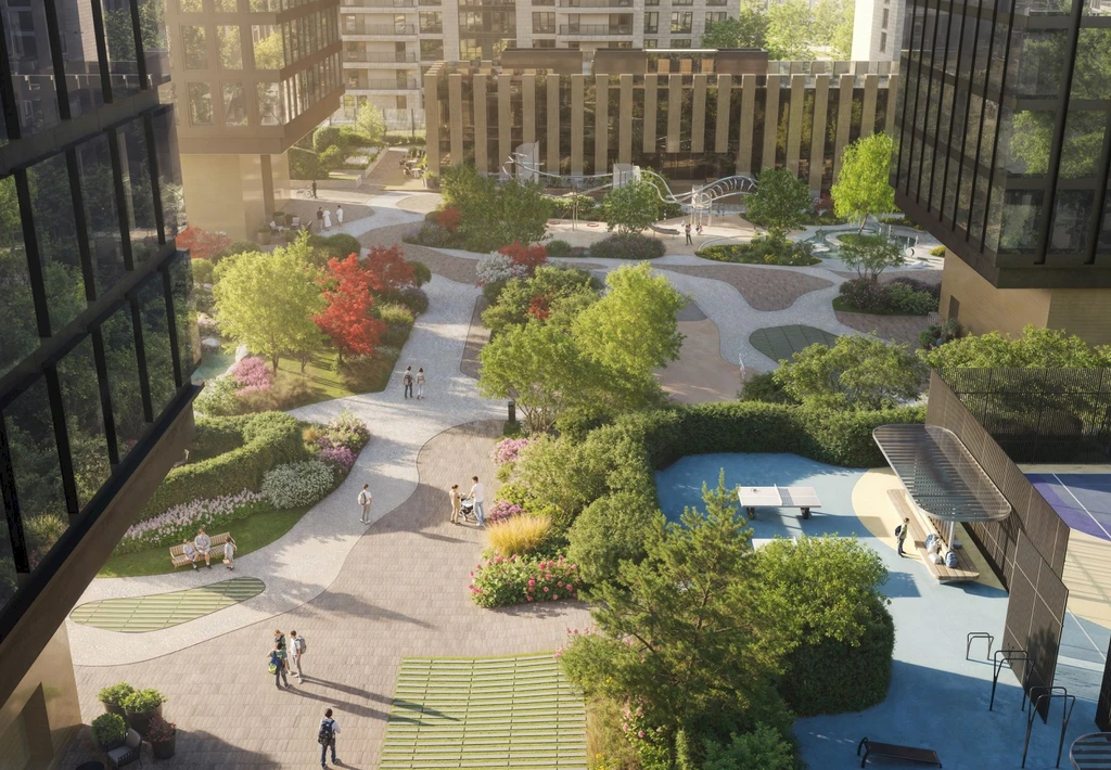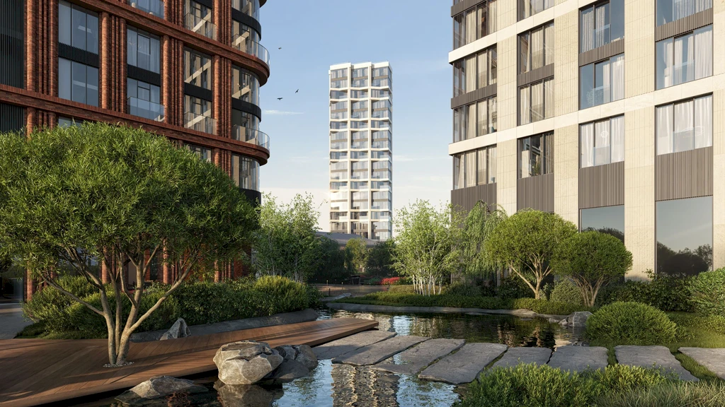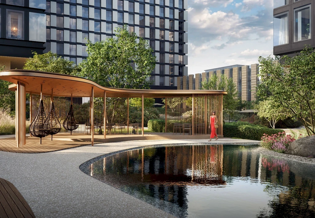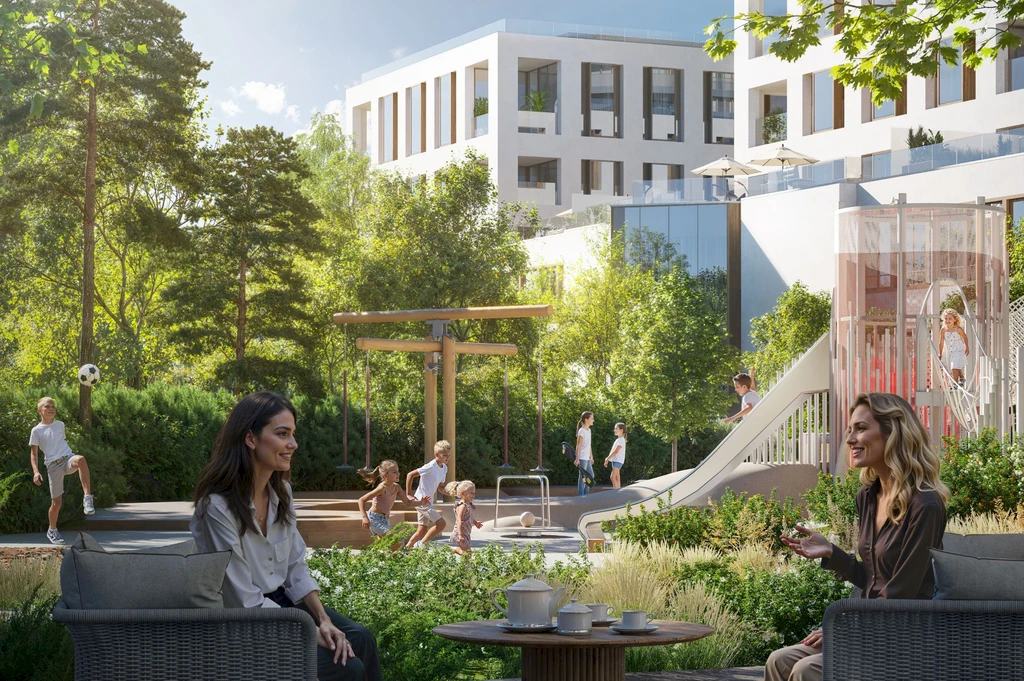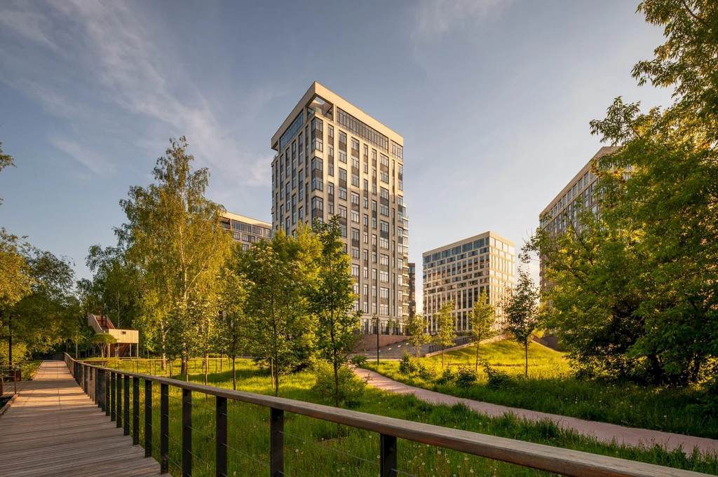 A central feature of the quarter is a private park of about 3.1 hectares, featuring walking paths, ponds, art objects, sports and children's areas, relaxation and yoga zones, as well as spaces for teenagers and pets.