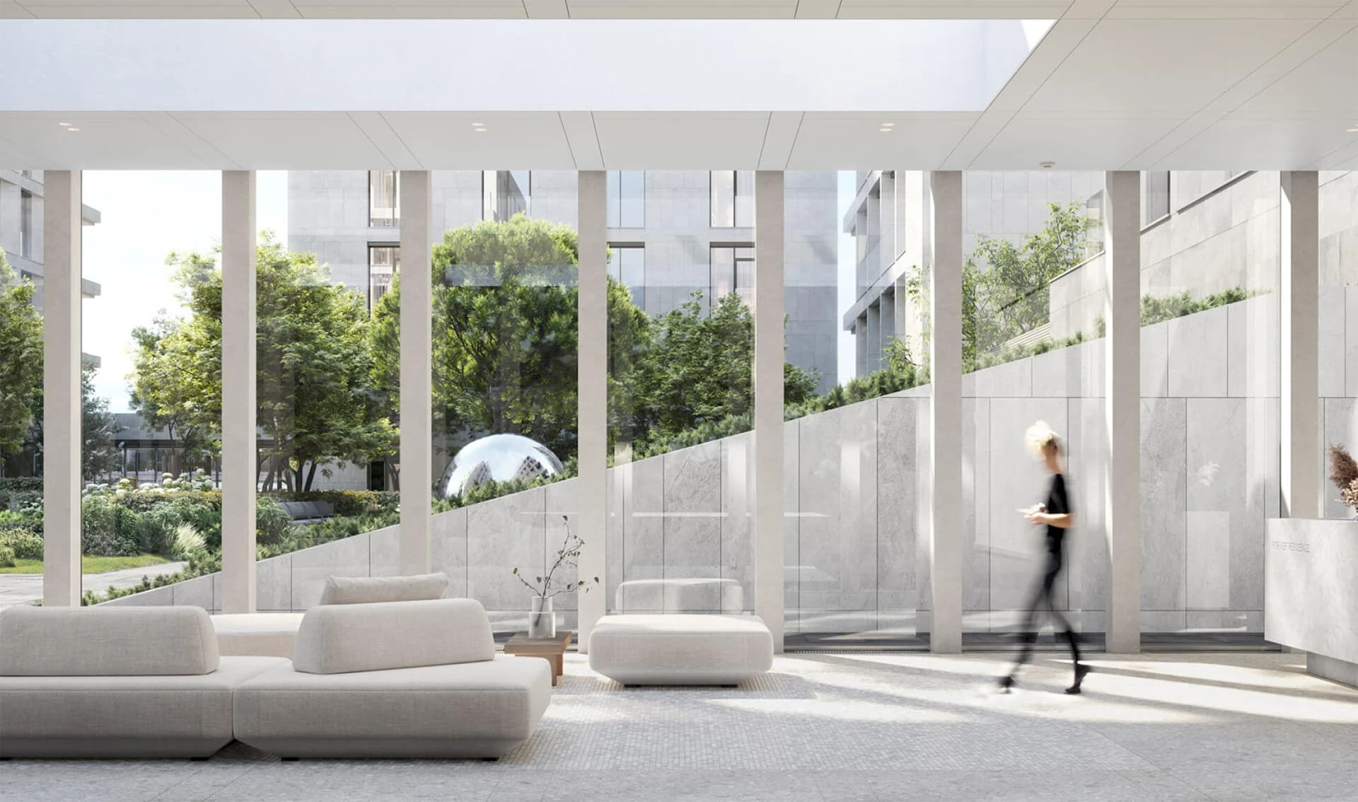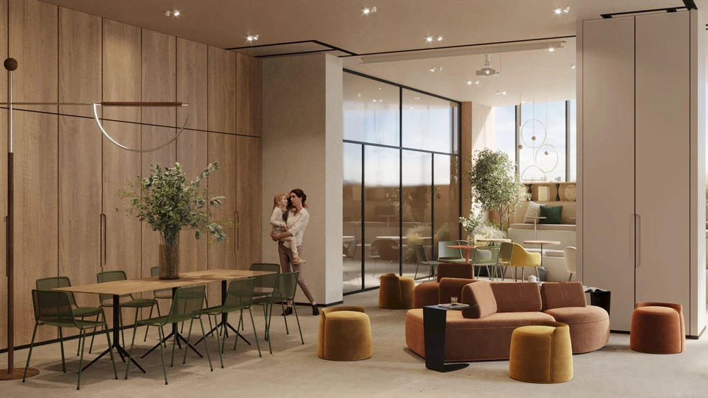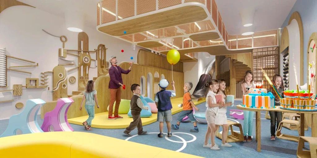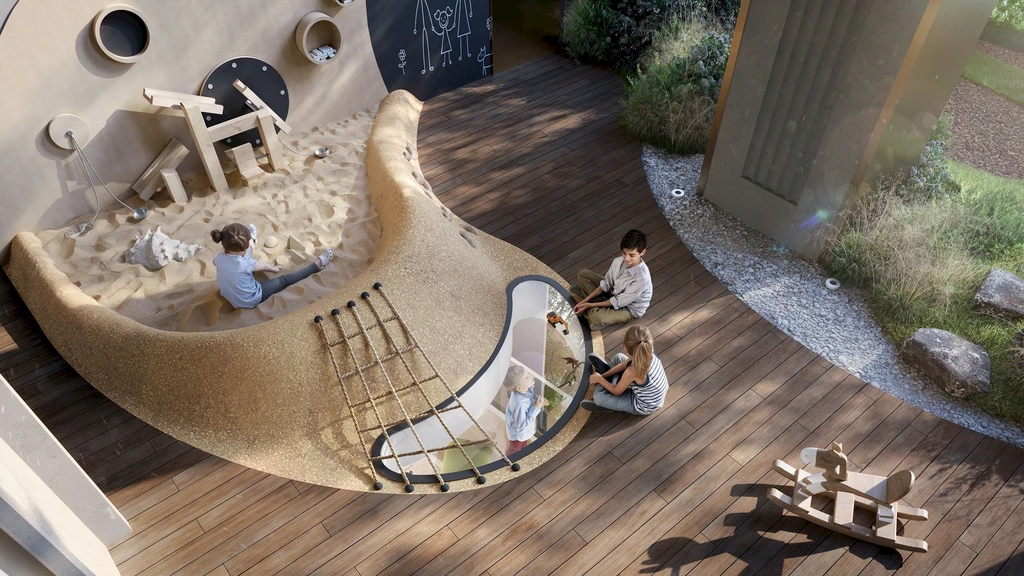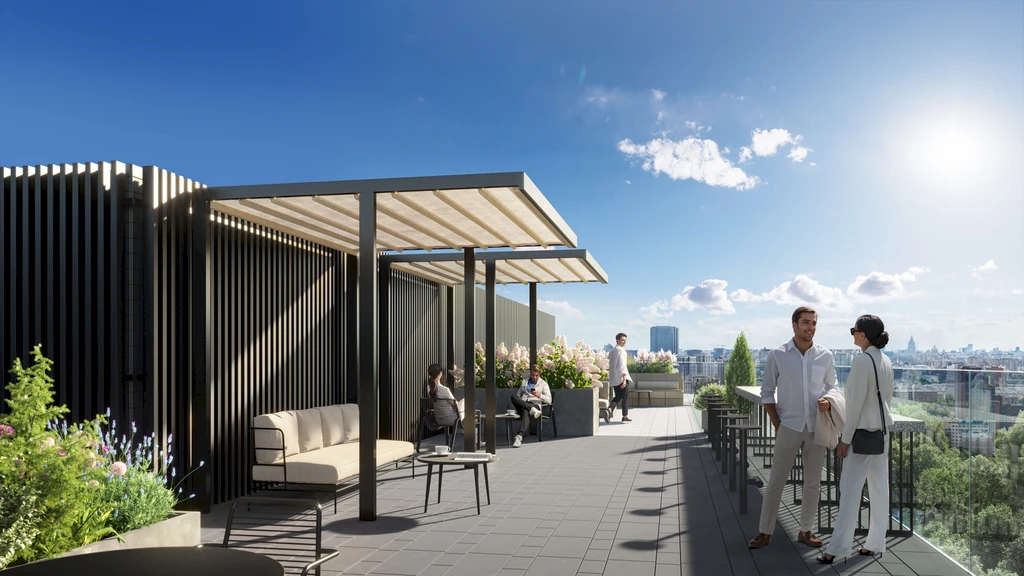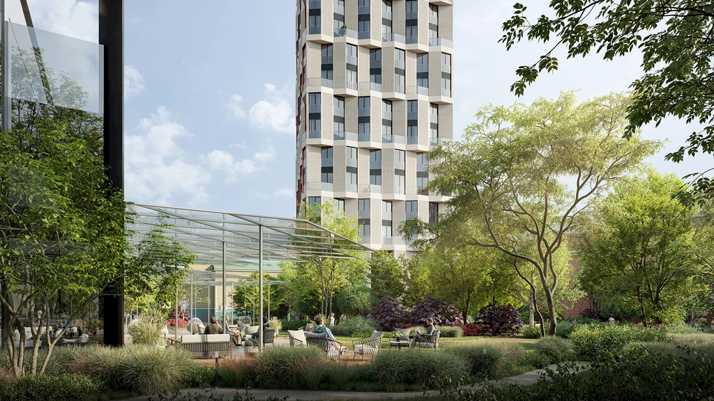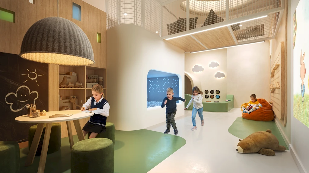 A central feature of the quarter is a private park of about 3.1 hectares, featuring walking paths, ponds, art objects, sports and children's areas, relaxation and yoga zones, as well as spaces for teenagers and pets.