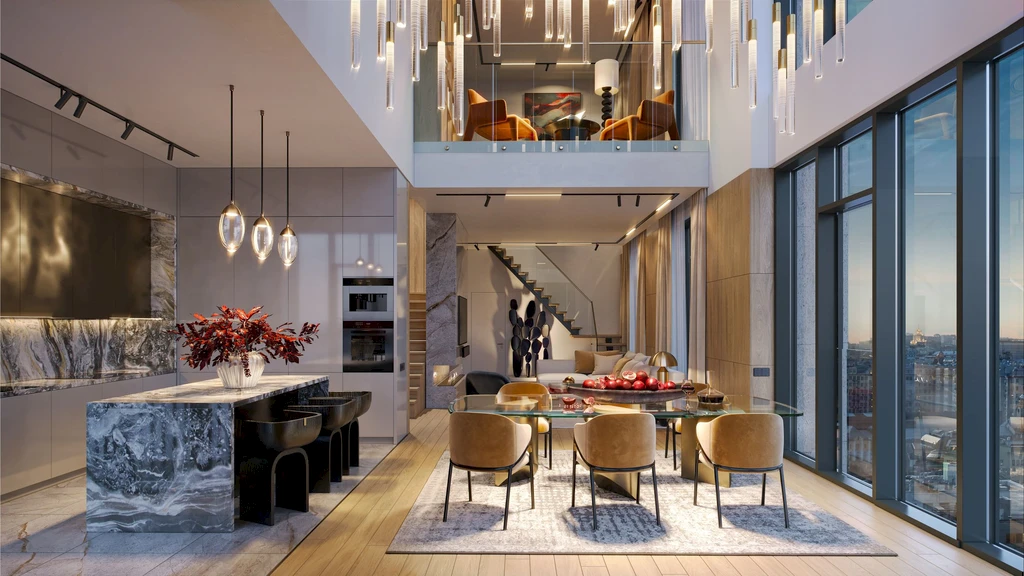 Some units feature ceilings up to 7 meters high, creating a sense of space and exclusivity.