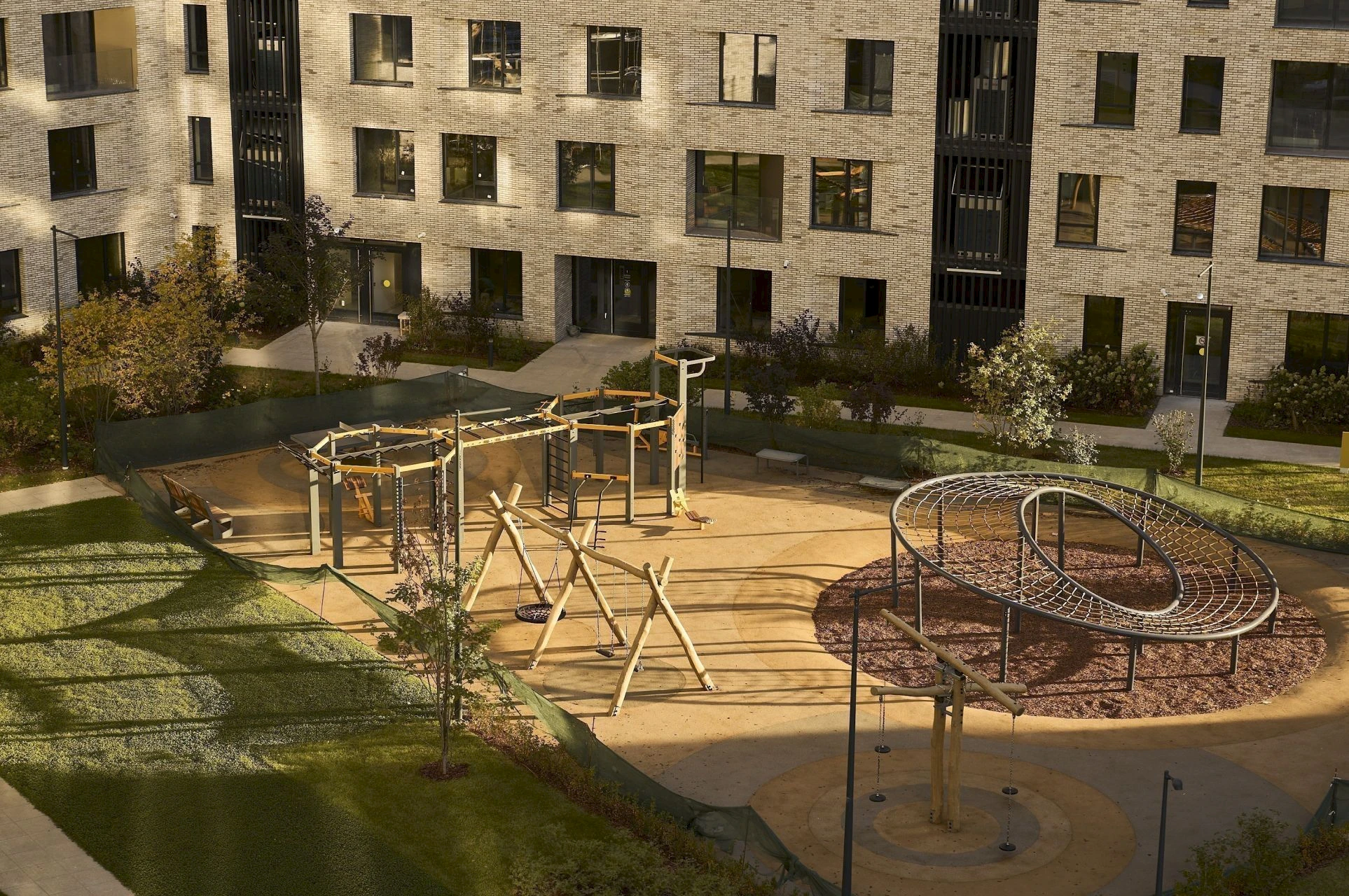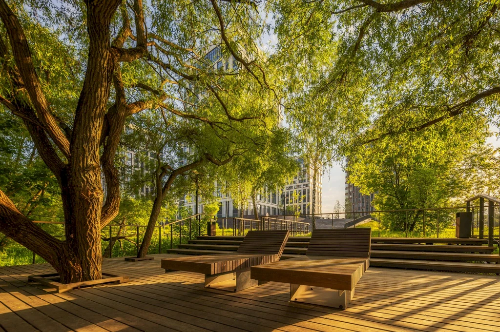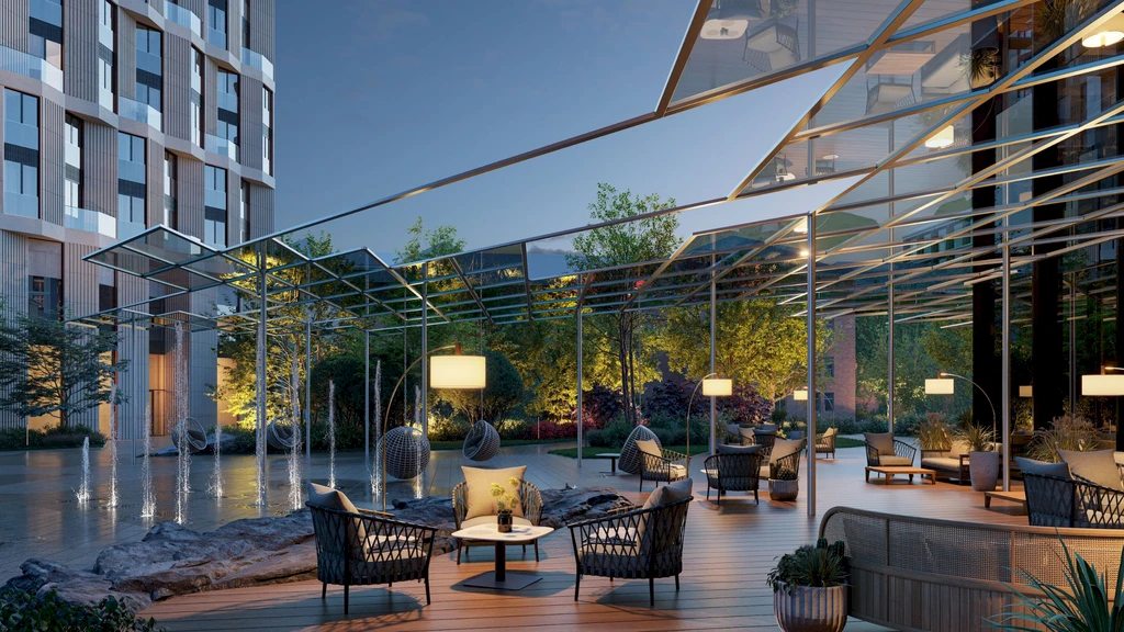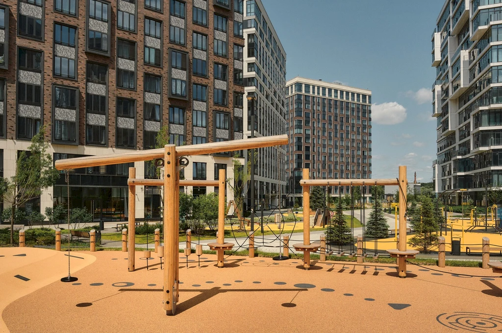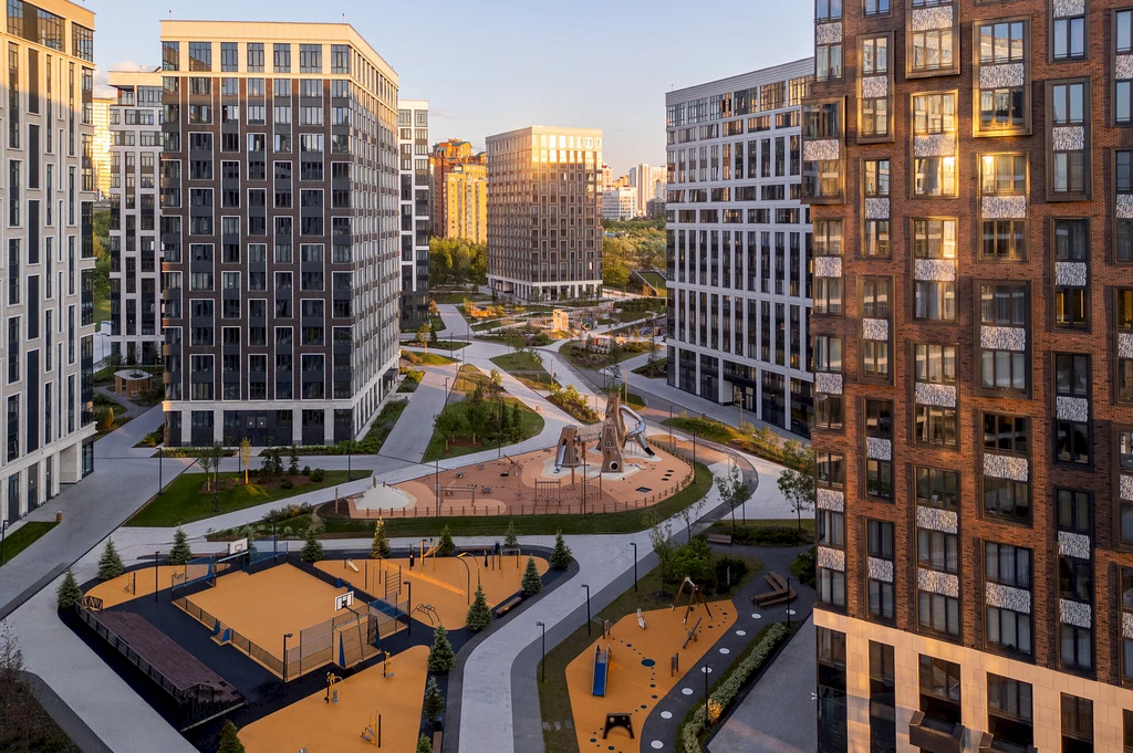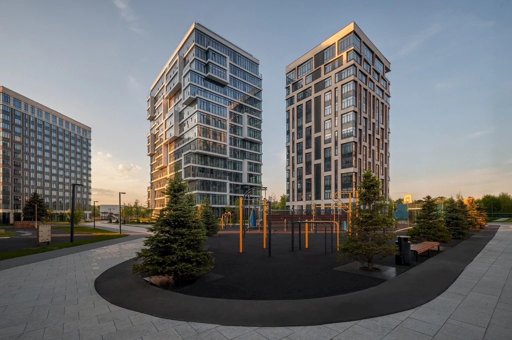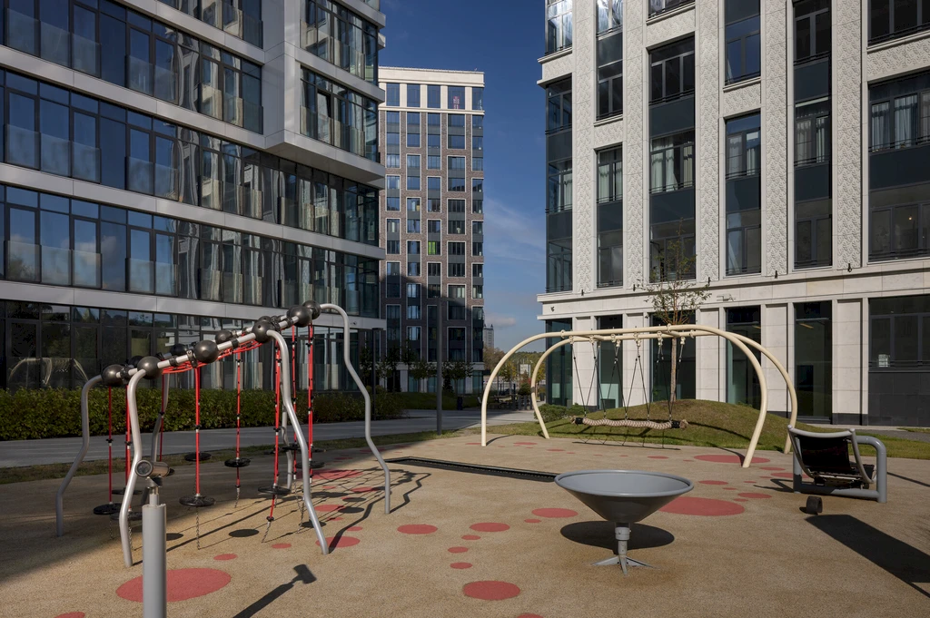 The inner territory of the complex is designed as a private space for relaxation and active living. A landscaped courtyard park of about 1.7 hectares has been created here, featuring walking alleys, relaxation areas, children's playgrounds, and sports spaces.