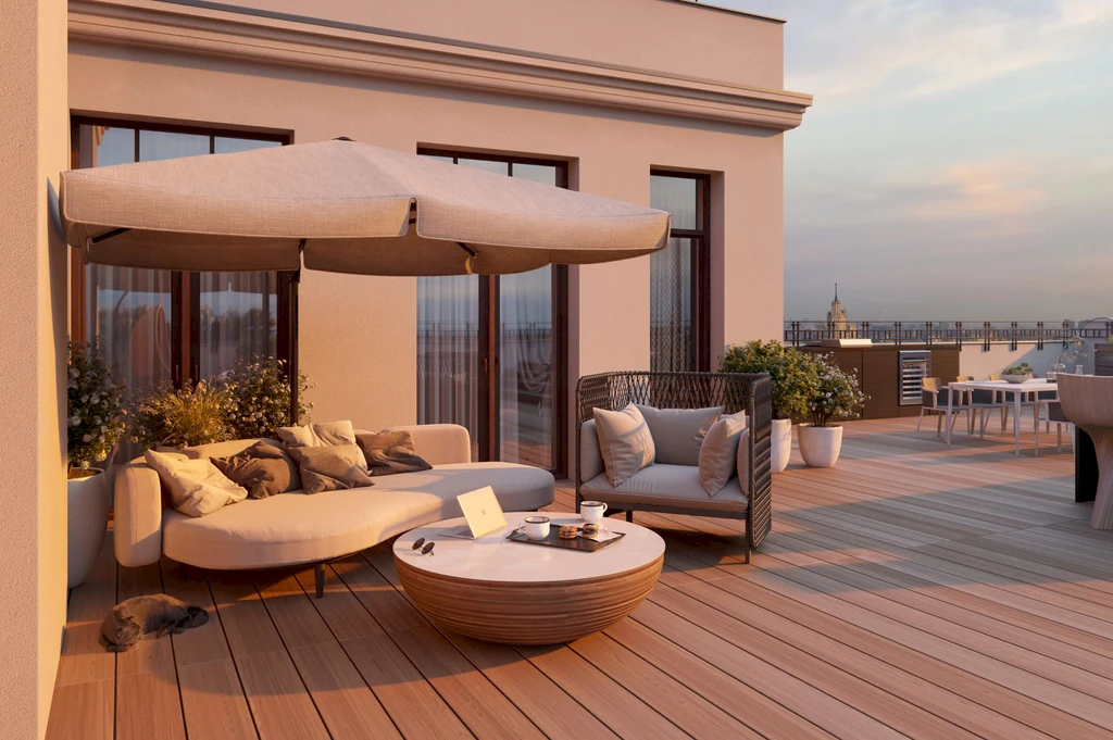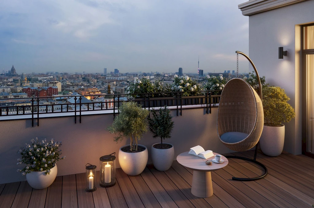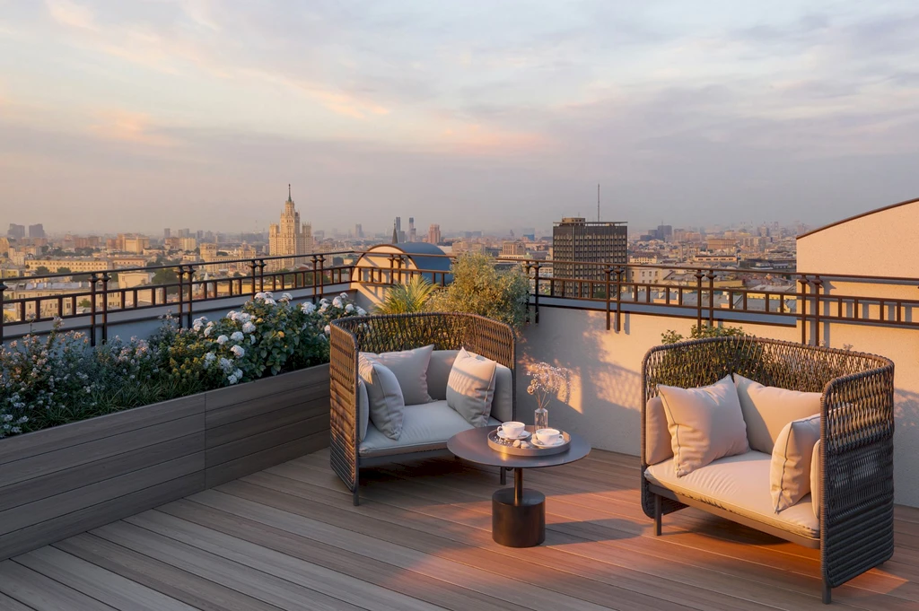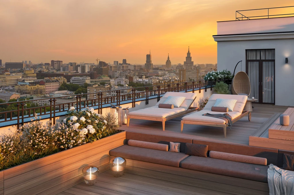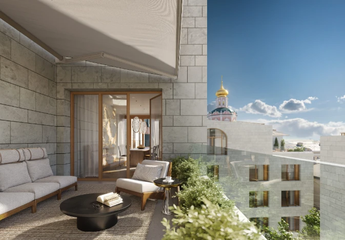 Historical buildings are complemented by modern comfort technologies: panoramic windows, ceilings up to 5.93 m, spacious layouts, and private terraces create an exclusive atmosphere.