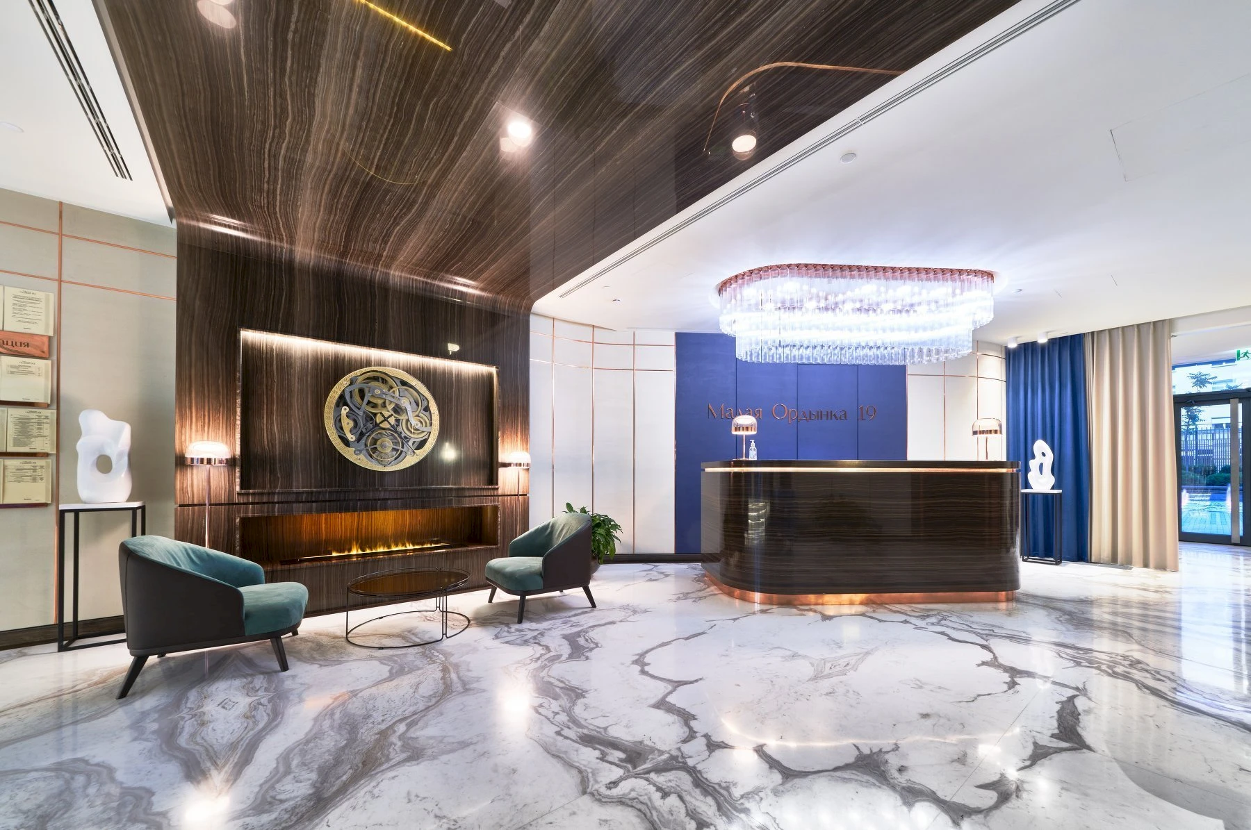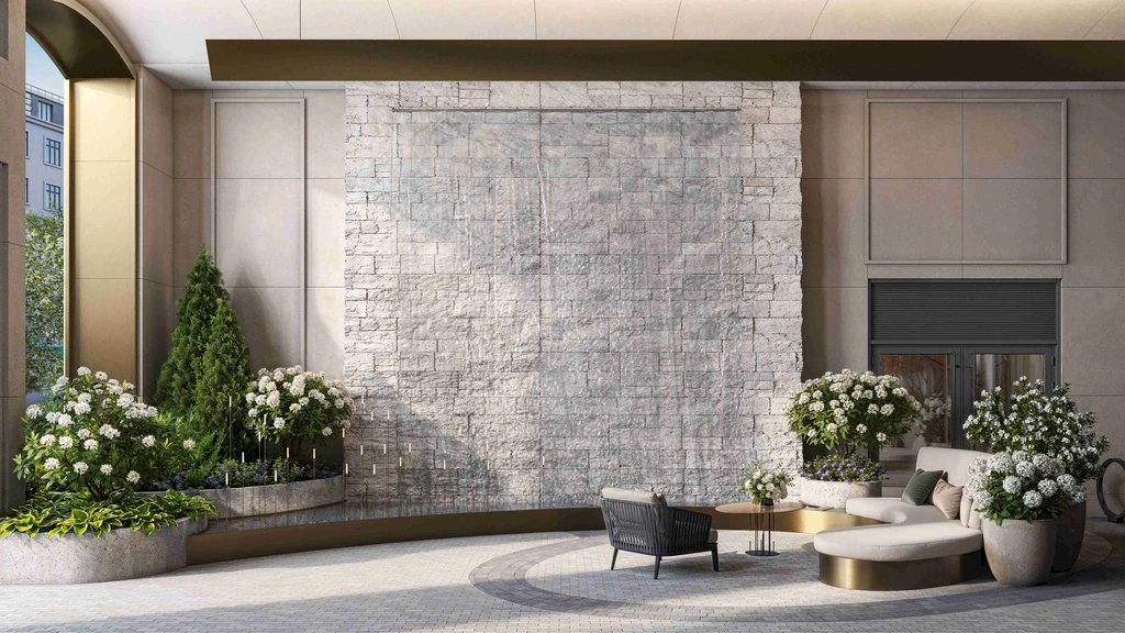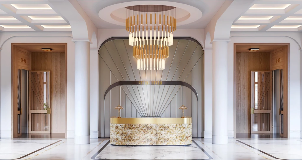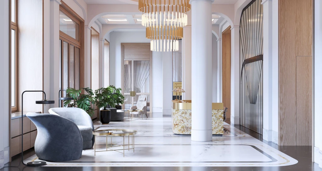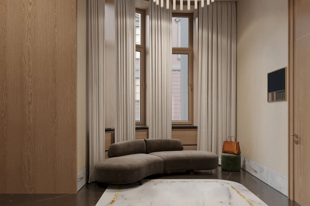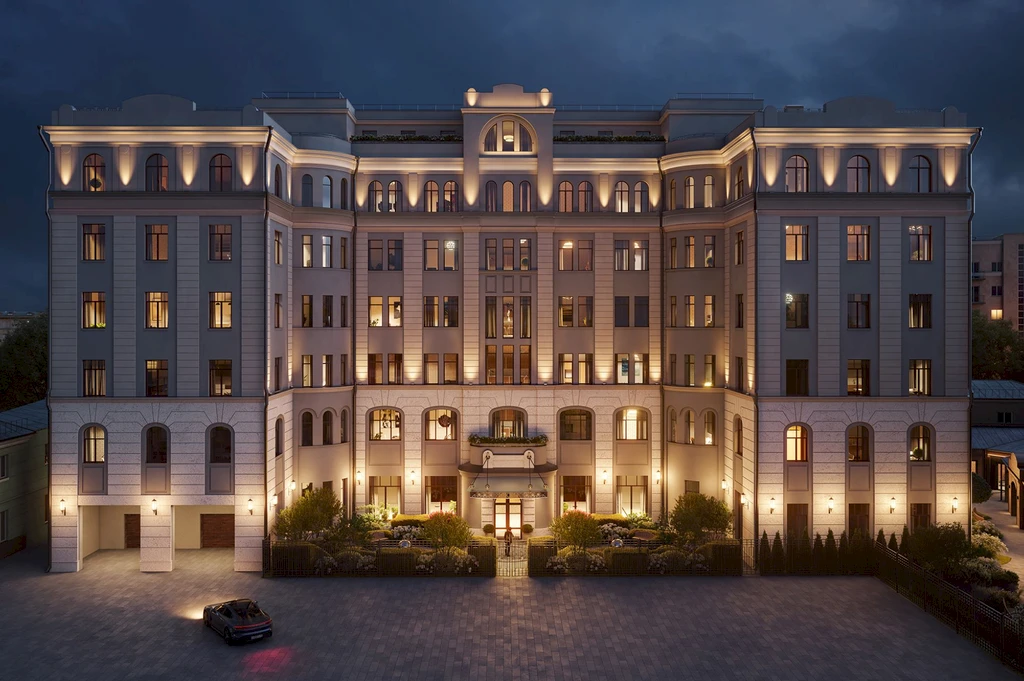 The architectural concept of the building is inspired by classical Moscow development and executed in a contemporary classical style. The façades are finished with natural stone and decorative elements that harmoniously integrate with the historic surroundings of the district. The entrance group features a spacious lobby with high ceilings and an elegant interior, creating the atmosphere of an exclusive club residence.