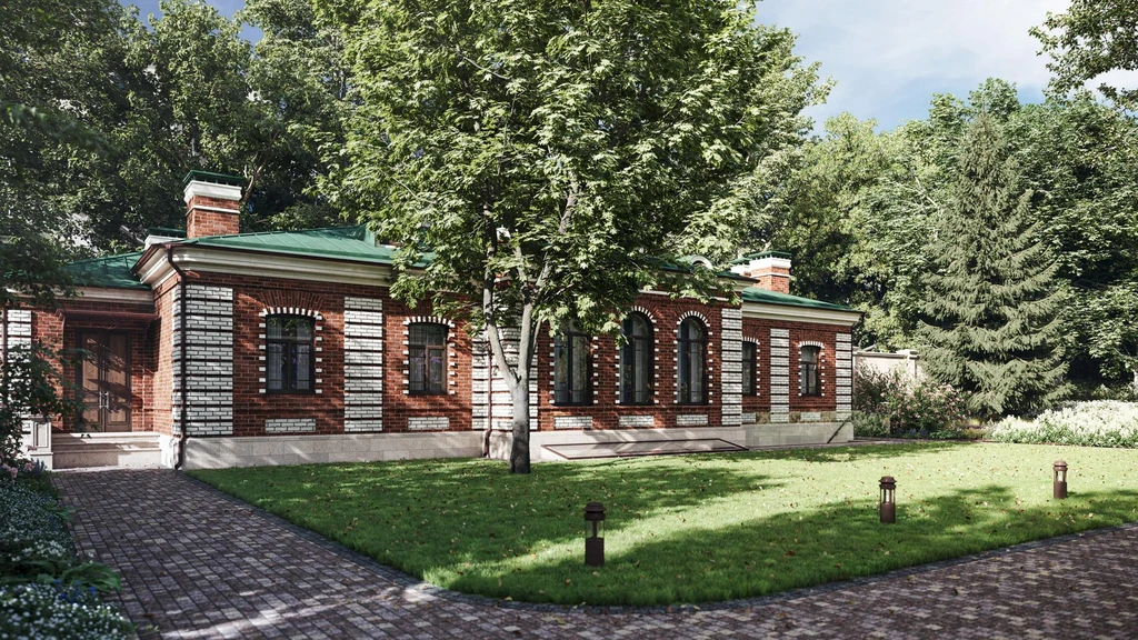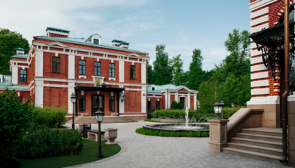 The architectural ensemble of the estate was formed in the 19th century and is associated with Count Orlov-Davydov. The buildings are designed in the late eclectic style and feature expressive façades with decorative elements and natural stone finishes. During the restoration process, special attention is given to preserving historical details such as hand-molded brickwork, original window openings, wrought-iron elements, and decorative architectural ornaments. This careful restoration preserves the authentic character of historic architecture.