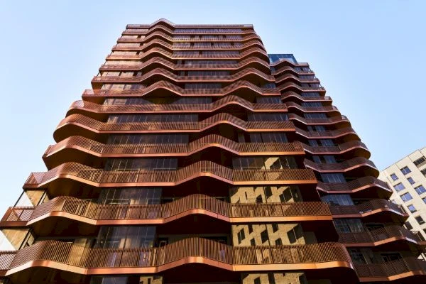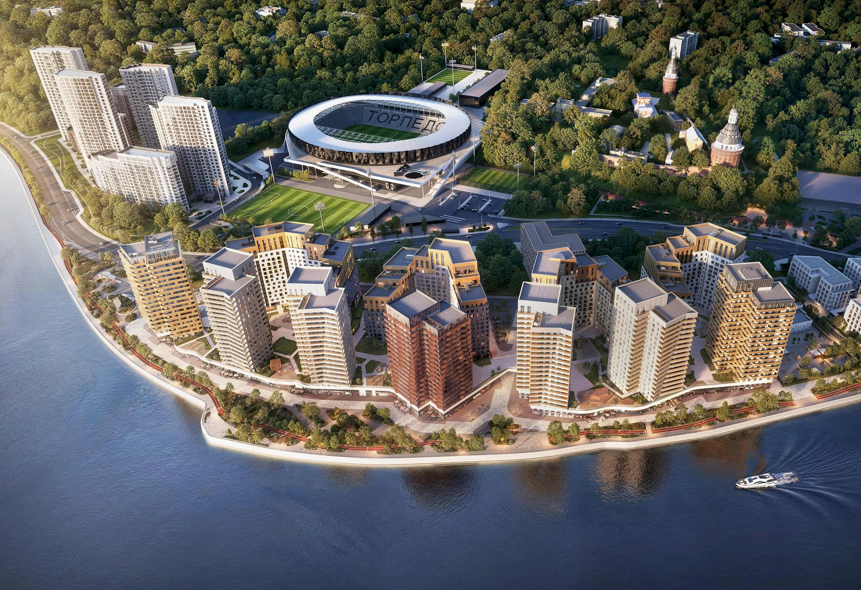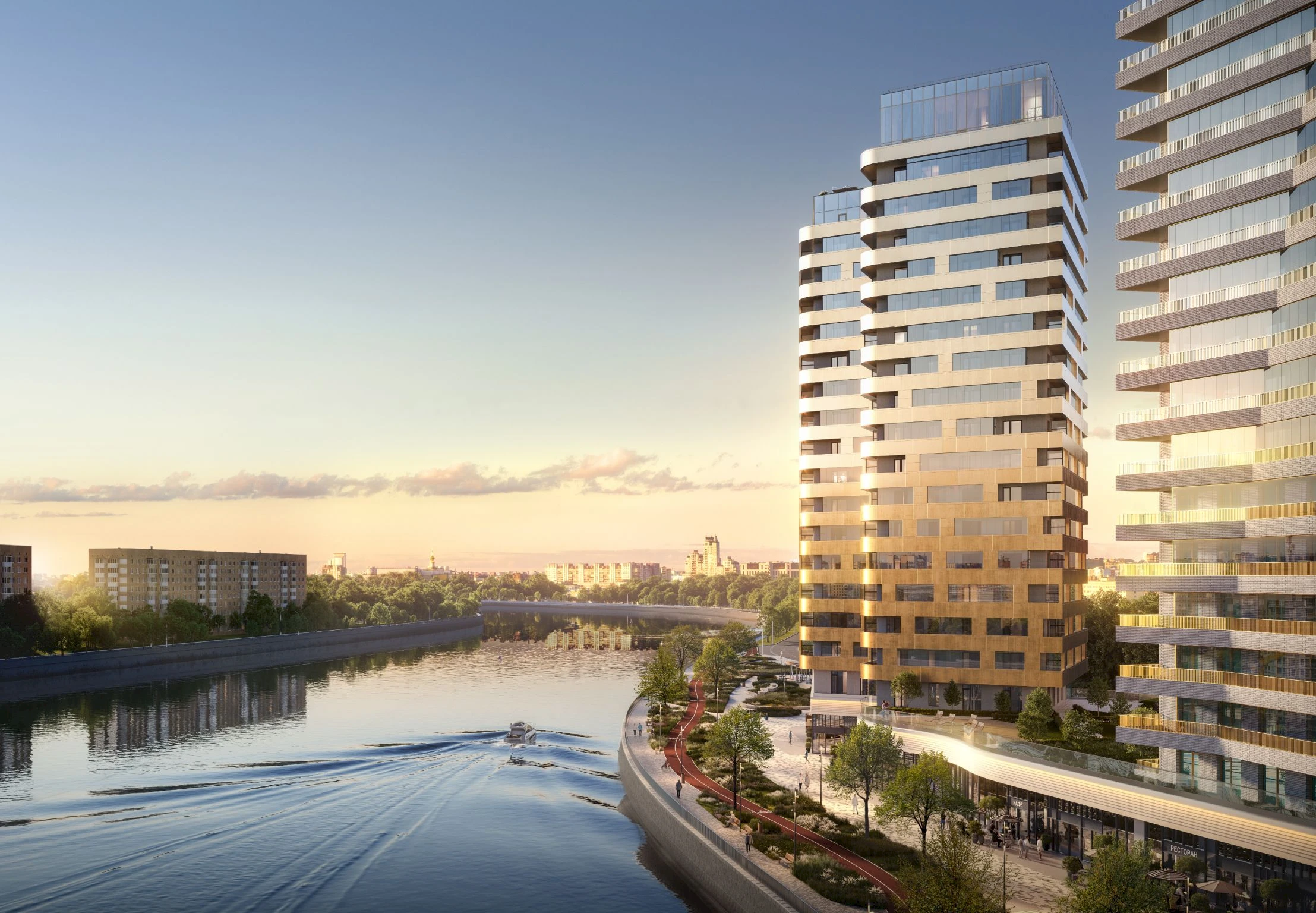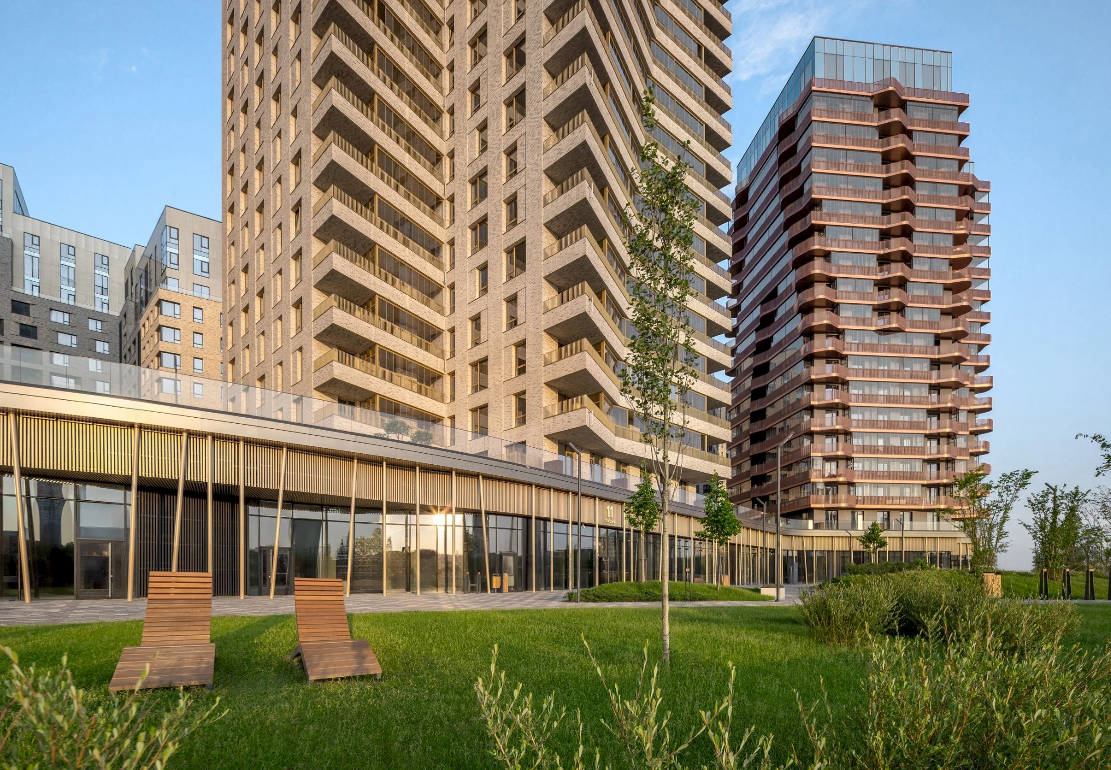 The facades are made of clinker brick and metal panels in warm tones, with accent glazing, forming a modern silhouette and emphasizing the dynamics of the embankment.