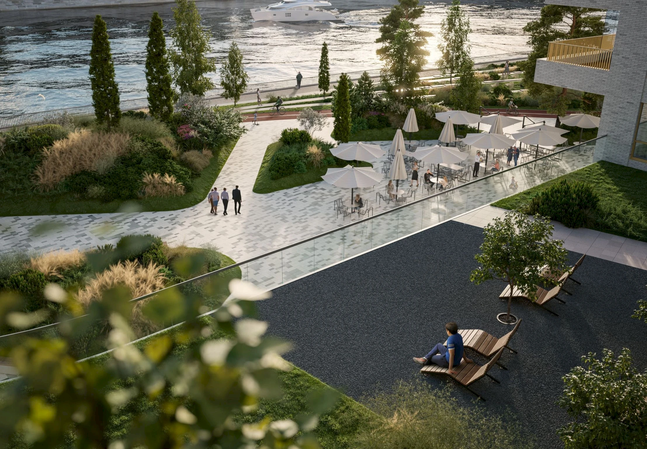A pedestrian boulevard with public spaces, cafés, and shops is located along the perimeter of the complex.