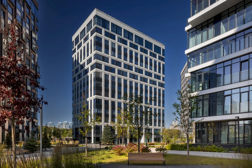 The architectural ensemble of the complex consists of three buildings ranging from 8 to 14 floors, constructed using monolithic building technology. The façades feature a modern design and expressive architectural forms, while extensive panoramic glazing allows for maximum natural light and opens views toward the historic center of the capital.