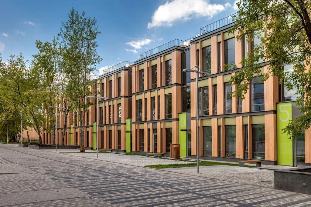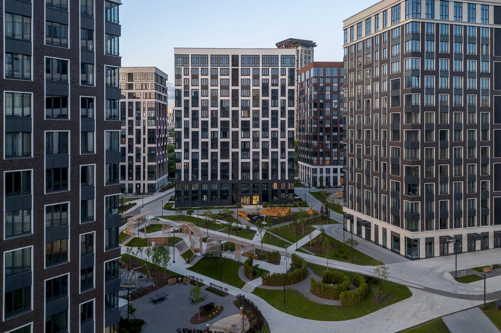 The project comprises 14 buildings of varying heights, ranging from 3 to 24 floors, including residential houses with unique facades, two-level apartments, and penthouses. The architecture combines traditional elements of Moscow construction with modern design solutions. Facades are made of high-quality materials—natural stone, clinker brick, and anodized aluminum—and large panoramic windows maximize natural light and open views over the city.