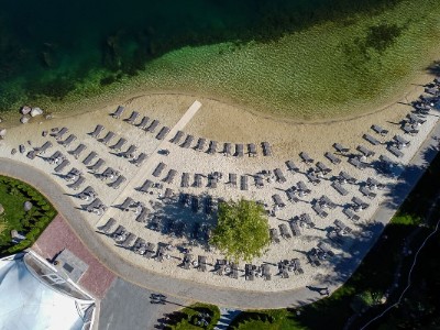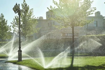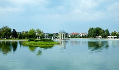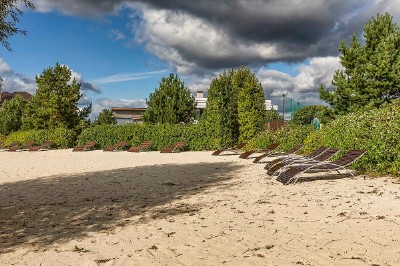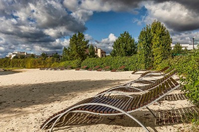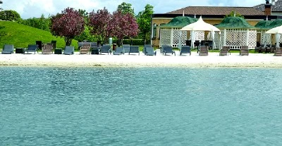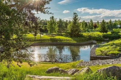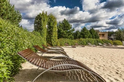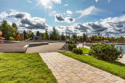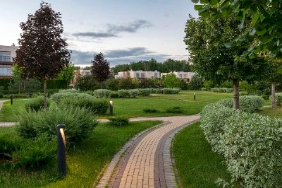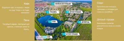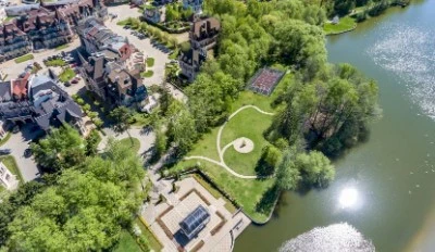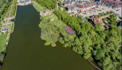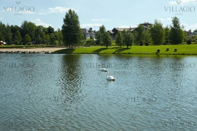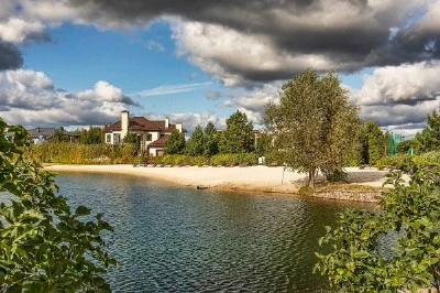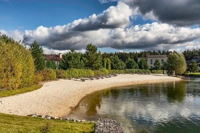 The settlement is surrounded by well-maintained park areas with artificial lakes, rotundas, fountains, and walking alleys. Landscape solutions include ornamental greenery, classical garden layouts, and custom landscaping. The central feature is a beach with white quartz sand, sun loungers, and a lakeside relaxation zone. Sports grounds, a football field, and playgrounds round out the outdoor amenities.