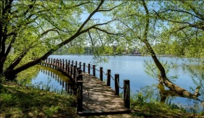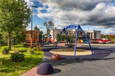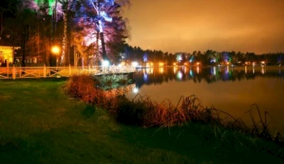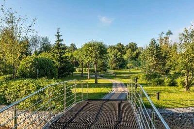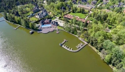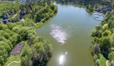 The centerpiece of the natural landscape is a large forest lake with a promenade, sandy beach, boat dock, and fishing piers. A special bay with miniature boats is designed for children. The entire landscape is thoughtfully integrated into the surrounding forest environment.